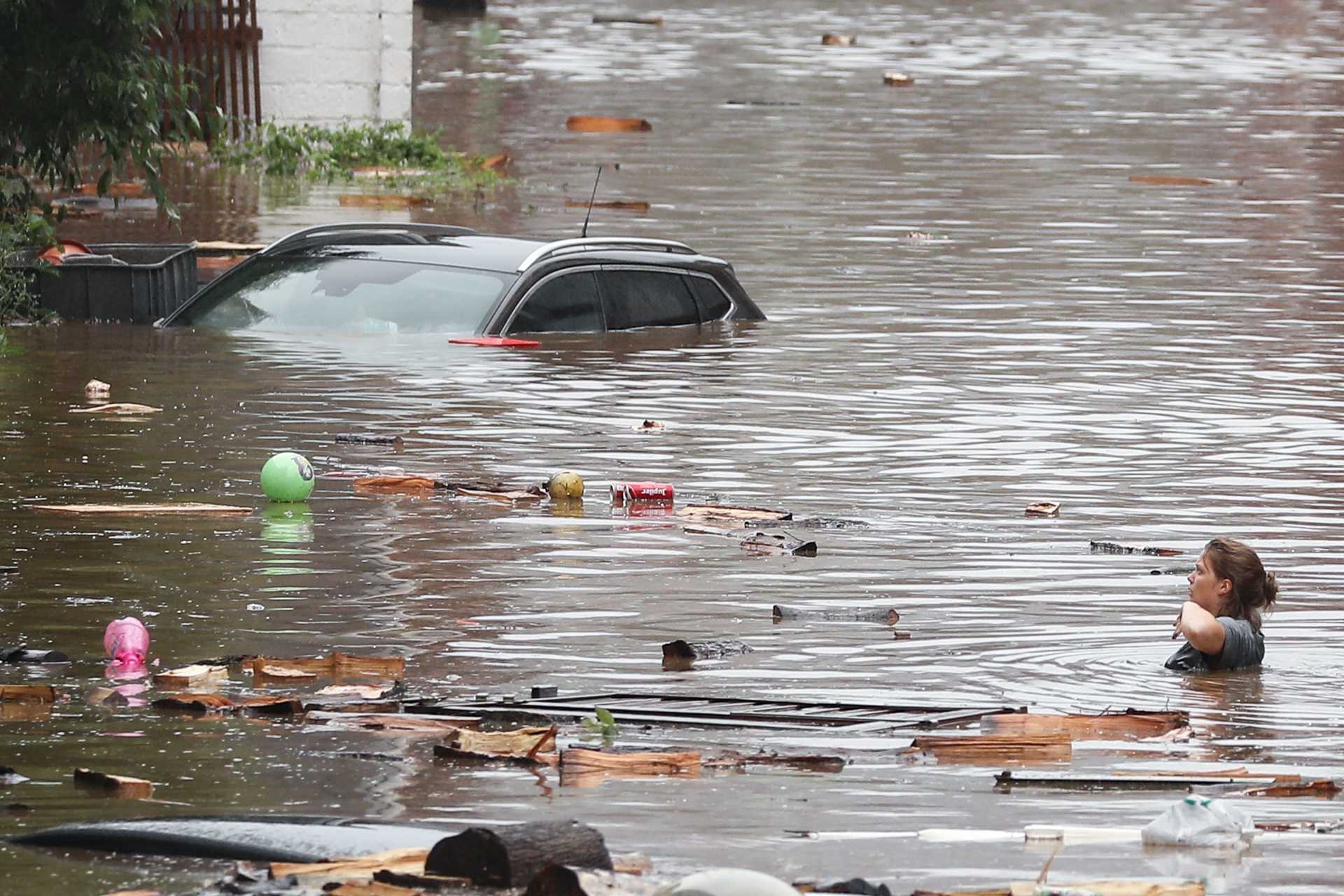 A woman is trying to move in a flooded street following heavy rains in Liege, on July 15, 2021.