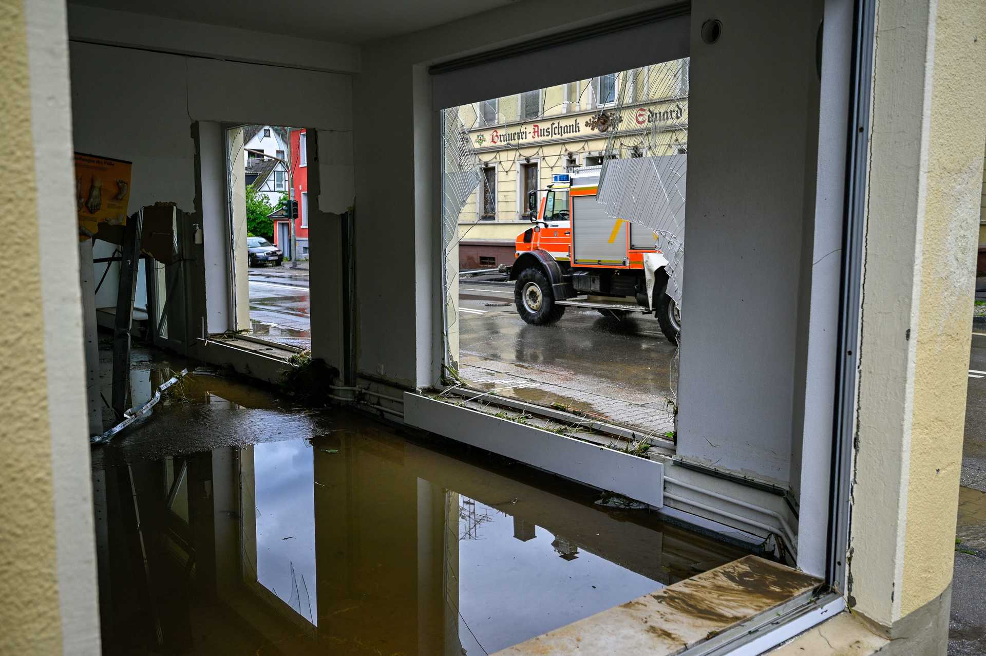 A vehicle of the fire brigades is seen through the damaged windows of a building caused by the floods of the Volme river on July 15, 2021 in Dahl near Hagen, western Germany, after heavy rain hit parts of the country, causing widespread flooding. – Heavy rains and floods lashing western Germany have killed at least nine people and left around 50 missing, as rising waters led several houses to collapse, police said. (Photo by SASCHA SCHUERMANN / AFP)