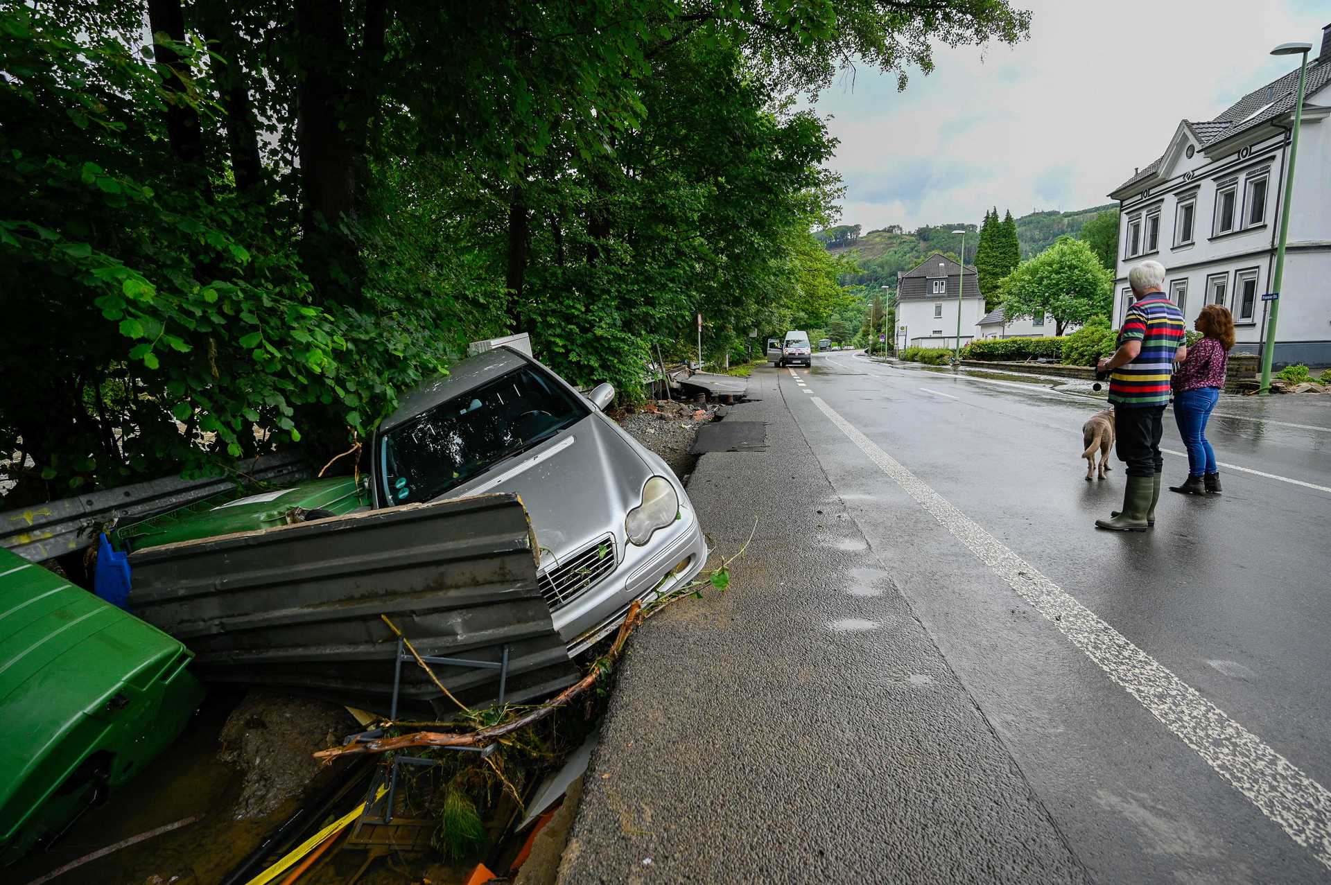 People look a at a destroyed car and other damages caused by the floods of the Volme river on July 15, 2021 in Priorei near Hagen, western Germany, after heavy rain hit parts of the country, causing widespread flooding. – Heavy rains and floods lashing western Germany have killed at least nine people and left around 50 missing, as rising waters led several houses to collapse, police said. (Photo by SASCHA SCHUERMANN / AFP)