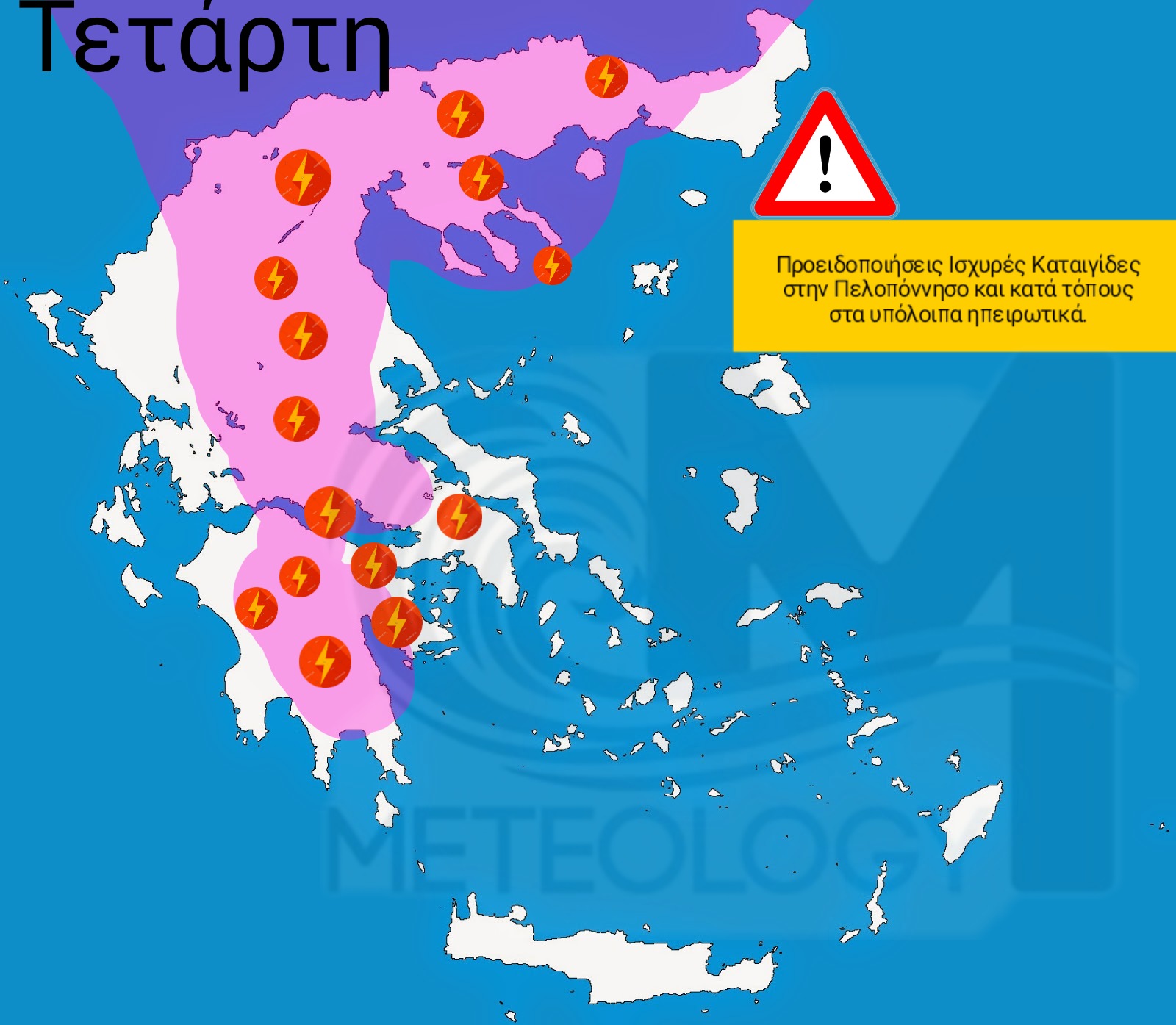 Καταιγίδες απογευματινου και μεσημεριανού τύπου θα σημειωθούν και σήμερα στα ηπειρωτικά. Αυτό που αλλάζει είναι ότι τα εντονότερα φαινόμενα θα τα έχουμε στο εσωτερικό της Στερεάς και την Πελοπόννησο. Ιδιαίτερα στην Πελοπόννησο οι Καταιγίδες στο εσωτερικό της θα έχουν διάρκεια και τοπικά θα συνοδεύονται από χαλαζοπτώσεις ικανές να προκαλέσουν προβλήματα. Σε Μακεδονία και Θεσσαλία, οι εστίες των Καταιγίδων θα είναι πιο περιορισμένες σήμερα, χωρίς φυσικά να αποκλείεται ένταση κατά τόπους. Σε Θεσσαλονίκη και πάλι το μεσημέρι απόγευμα θα έχουμε τοπικές μπόρες η και Καταιγίδα. Στην Αττική θα εκδηλωθεί καταιγίδα στα δυτικά και βόρεια του νομού.