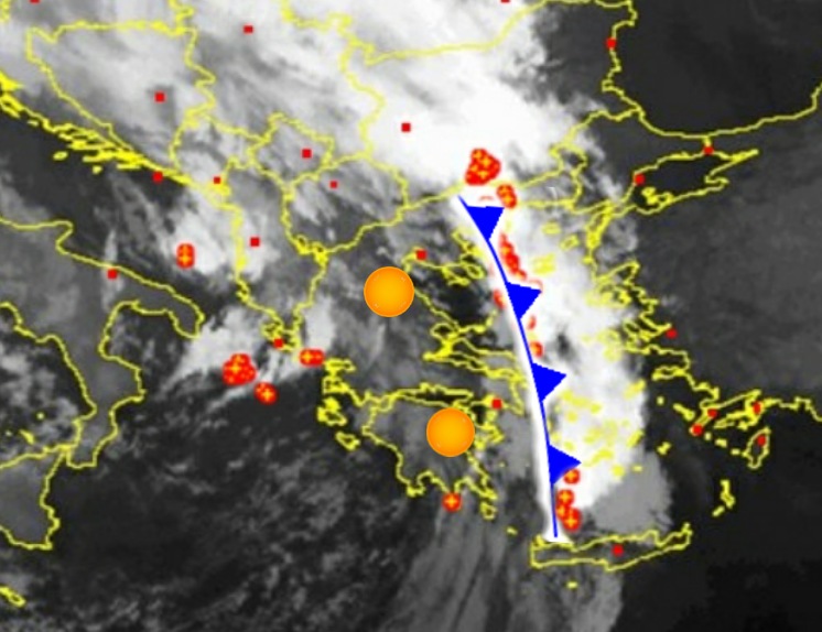 Στην δορυφορική εικόνα βλέπουμε το ψυχρό μέτωπο, να έχει διασχίσει πλέον το σύνολο της χώρας κατά την διάρκεια των πρώτων πρωινών ωρών, και αυτή την στιγμή να πλησιάζειστο ανατολικό Αιγαίο και ανατολική Μακεδονία Θράκη. Στην υπόλοιπη χώρα, ο καιρός βελτιώνεται και η λιακάδα θα κυριαρχήσει. Εξαίρεση μόνο η ΒΔ χώρα όπου εδώ ο άστατος καιρός παραμένει μέχρι το μεσημέρι.