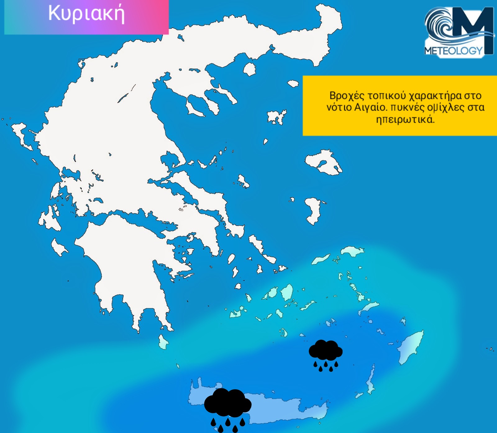 Αλλάζει ο καιρός την Κυριακή στην νότια χώρα. Αρκετές νεφώσεις θα δώσουν μέσα στην ημέρα, βροχές ποτιστικού χαρακτήρα σε όλο το νότιο Αιγαίο. Τα φαινόμενα θα υποχωρήσουν προς το βράδυ της ίδιας ημέρας, ενώ θα αρχίσει να βρέχει στα δυτικά την νύχτα. Πυκνές ομίχλες στα ηπειρωτικά.
