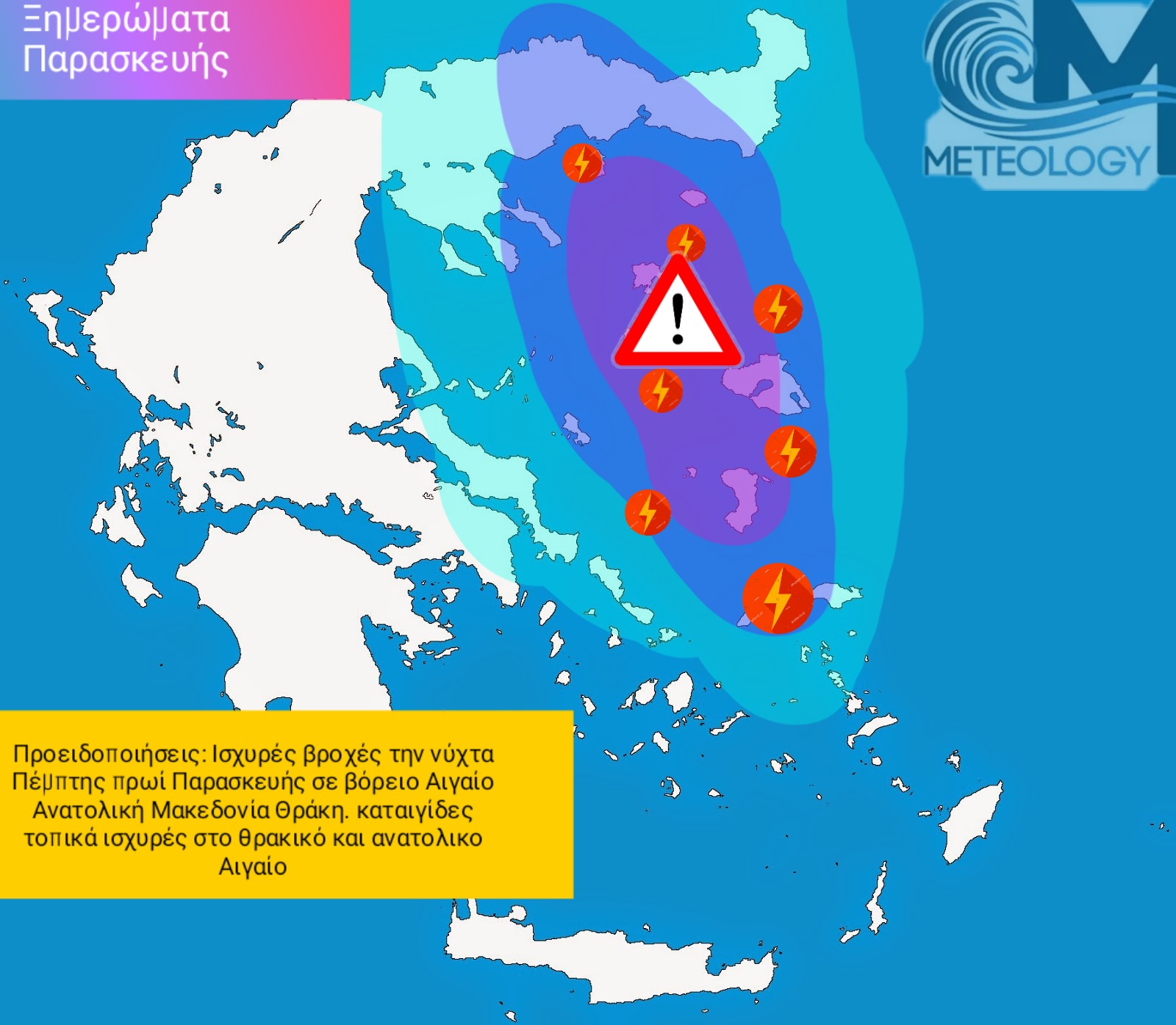 Αλλάζει ο καιρός μέσα στην Παρασκευή με κύρια χαρακτηριστικά τους ισχυρούς βοριάδες, την πτώση θερμοκρασίας αλλά και τις δυνατές βροχές, στις περιοχές που τονίζονται στον χάρτη. Τα φαινόμενα θα εστιάζονται την Παρασκευή σε βόρειο και ΒΑ Αιγαίο σε νότια Χαλκιδική Ανατόλικη Μακεδονία και Θράκη. Πάντως ο καιρός θα βελτιωθεί ήδη από το απόγευμα της ίδιας ημέρας και το ΣΚ θα κυριαρχεί ηλιοφάνεια και κατακόρυφη άνοδος της θερμοκρασίας.