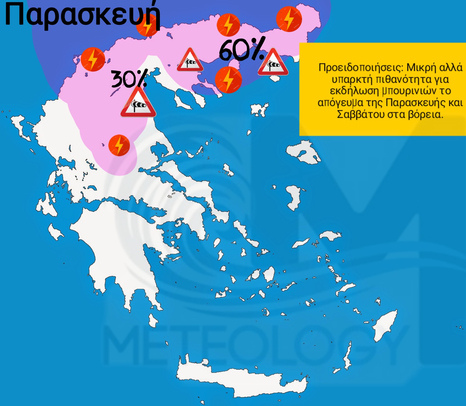 Μικρή αλλά σαφώς υπάρχει, η πιθανότητα για να σημειωθούν ξηρικές καταιγίδες το απόγευμα της Παρασκευής στις περιοχές που σας τονίζω με χρωματισμό. Περισσότερες πιθανότητες συγκεντρώνει η ανατολική Μακεδονία, εκεί ακτές Καβάλας, ίσως έχουμε μπουρίνι το απόγευμα αργά. Οι καταιγίδες, θα αναπτυχθούν αργά το απόγευμα, στην κορύφωση της ημερήσιας ζέστης, στο χρονικό δηλαδή εκείνο σημείο, όπου η ατμόσφαιρα, έχει το μέγιστο της θερμικής ενέργειας από το λιοπυρι. Τα κύτταρα – και αυτό πρέπει να τονιστεί- θα έχουν γρήγορη κίνηση από βόρεια προς νότια, όπου και αν εμφανιστούν. Έτσι αυτονόητα καταλαβαίνουμε ότι οι ηπειρωτικές καταιγίδες των Σκοπίων και της Βουλγαρίας, αλλά και της Μακεδονίας μας και της Θράκης, θα καταλήγουν στις ακτές, πιθανόν ως μπουρίνια. Αναφέρομαι πάντα για αργά το απόγευμα, όχι νωρίτερα. Αν δείτε λοιπόν να μαζεύει σύννεφα προς τον βόρειο ορίζοντα σας, έχετε το νου σας, πιθανόν ένα μπουρίνι να είναι καθ οδόν. Ένα άλλο χαρακτηριστικό, θα είναι η μεγάλη ηλεκτρική δραστηριότητα που θα συνοδεύουν τα κύτταρα αυτά. Πολλοί κεραυνοί, θα αυξήσουν σημαντικά την επικινδυνότητα των καταιγίδων. ΠΆΝΤΩΣ, οι εστίες θα είναι γενικά μεμονωμένες και σε εξαιρετικά τοπικό επίπεδο, στις περιοχές που σας τονίζω. Ο υετός τέλος που θα συνοδεύει αυτές τις Καταιγίδες, θα είναι κατά κανόνα φτωχός. Λίγη η βροχή δηλαδή μέσα σε αυτά τα κύτταρα, ενώ ένα άλλο χαρακτηριστικό τους θα είναι το μεγάλο άπλωμα του πάνω μέρος τους ( αμόνι) λόγω των ισχυρών ανέμων στην ανώτερη τροποσφαιρα.