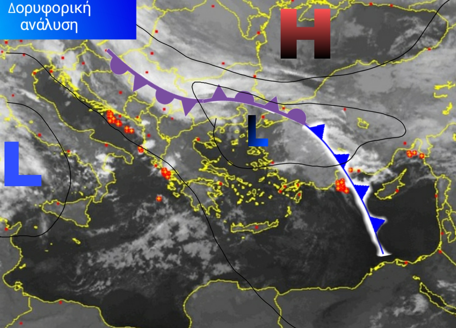 Πάμε να ρίξουμε και μια ματιά στον δορυφόρο! Όπως βλέπουμε, το χαμηλό που μας επηρέασε, καταρρέει στα ΒΑ της χώρας μας, ενώ τα μέτωπα κακοκαιριας του, βρίσκονται πλέον στα Βαλκάνια και την Τουρκία αλλά και την Κύπρο. Η σύσφιξη στην Βουλγαρία, δίνει τώρα εκεί βροχές αλλά και πυκνές χιονοπτώσεις σε σχετικά χαμηλό υψόμετρο. Η χώρα μας, ήδη βρίσκεται και θα βρεθεί ανάμεσα στα δύο χαμηλά, έτσι την Τρίτη η λιακάδα θα κυριαρχεί. Από το μεσημέρι πάντως θα δούμε ξανά από τα δυτικά να συννεφιάζει καθώς το δεύτερο χαμηλό το οποίο βλέπουμε τώρα στην Ιταλία, θα κινείται στην χώρα μας και θα δώσει νέο κύμα βροχών και καταιγίδων την Τετάρτη και Πέμπτη.
