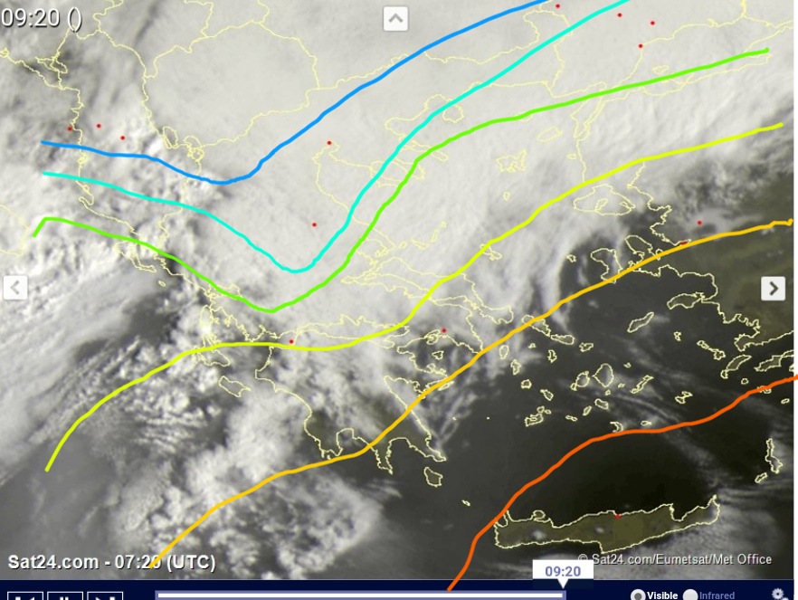 Στα δύο καιρικά είναι χωρισμένη η χώρα σήμερα Κυριακή. Θερμές αέριες μάζες στα νότια , κρύο και βροχή αλλά και χιονοπτώσεις στην δυτική Μακεδονία καθώς οι θερμοκρασίες εκεί είναι ιδιαίτερα χαμηλές. Παράλληλα, αξιοσημείωτη μεταφορά αφρικανικής σκόνης στην ανώτερη ατμόσφαιρα της νότιας χώρας. Προσέξτε το πόσο συμπαγής είναι η νέφωση στην ηπειρωτική Ελλάδα, η οποία δεν είναι άλλη παρά το θερμό μέτωπο της διαταραχής.