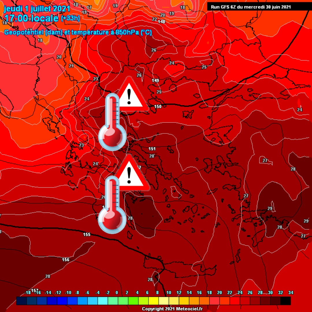 Το μεσημέρι της Πέμπτης, σε Αρκαδία Αργολίδα , Βοιωτία, Φθιώτιδα, Λάρισα σε κόκκινο συναγερμό για αύριο, ενδεχομένως να δούμε και 45ρι σε κάποια από τα παραπάνω τμήματα, αλλά με εξαιρετικά χαμηλή υγρασία ( 8-15%) και ισχυρό δυτικό άνεμο. Απαιτείται μεγάλη προσοχή για κίνδυνο εκδήλωσης πυρκαγιάς. Λάβετε τέλος υπόψη την μεγάλη άνοδο της θερμοκρασίας σε αυτά τα τμήματα.