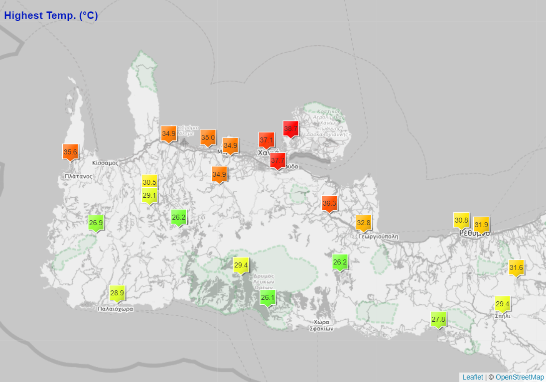 Οι καταβάτες νοτιάδες που από το πρωί πνέουν ισχυροί στην Κρήτη, εκτόξευσαν τον υδράργυρο στη βόρεια πλευρά της, ακόμη και στους 38.5 βαθμούς κελσίου, ενώ το σύνολο του νησιού βιώνει θερμοκρασίες πάνω από 30 βαθμούς. Την ίδια ώρα, η επελαση του ψυχρού μετώπου στα δυτικά και βόρεια, έχει ρίξει αισθητά τον υδράργυρο τις τελευταίες ώρες, ακόμη και κάτω από τους 17 βαθμούς. Ο καιρός πάντως βελτιώνεται στις περιοχές όπου είχαμε βροχές τις επόμενες ώρες και την Κυριακή η ηλιοφάνεια θα κυριαρχεί.