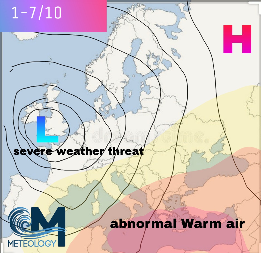 Ο Οκτώβρης, φαίνεται να ξεκινάει ” στα άκρα” πάνω από την Ευρώπη. Τα ” φώτα της δημοσιότητας” θα στραφούν πάνω από ένα πραγματικά γιγαντιαίο βαρομετρικό χαμηλό, το οποίο θα σχηματιστεί στην δυτική ΒΔκη Ευρώπη, και θα αλλάξει δραματικά τον καιρό σε Ισπανία, Γαλλία Αγγλία αλλά και Γερμανία, με ισχυρές βροχές και θυελλώδεις ανέμους αλλά και κρύο. Το βαρομετρικο αυτό χαμηλό, θα φέρει στην χώρα μας, ένα ασυνήθιστο κύμα ζέστης από την Αφρική, στις πρώτες μέρες του μήνα. Αξίζει να σημειωθεί,πως υπάρχουν σενάρια που θέλουν την θερμοκρασία να αγγίζει και τους 36 βαθμούς κατά τόπους! Βέβαια, όπως πολλές φορές συμβαίνει όταν οι θερμές εισβολές γίνονται φθινόπωρο, αυτές συνοδεύονται από νέφη ανώτερης ατμόσφαιρας, τα οποία μετριάζουν κατά πολύ, την επίδραση της στην επιφανειακή θερμοκρασία. Για την εξέλιξη αυτή, θα μιλήσουμε και στα επόμενα δελτία μας.