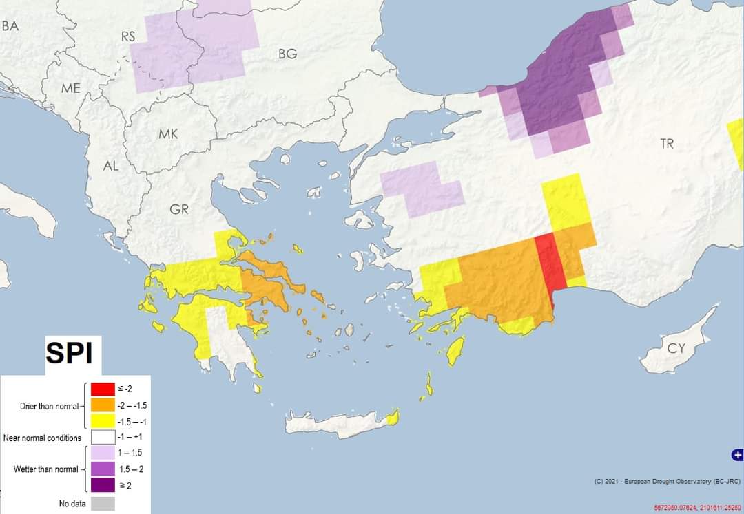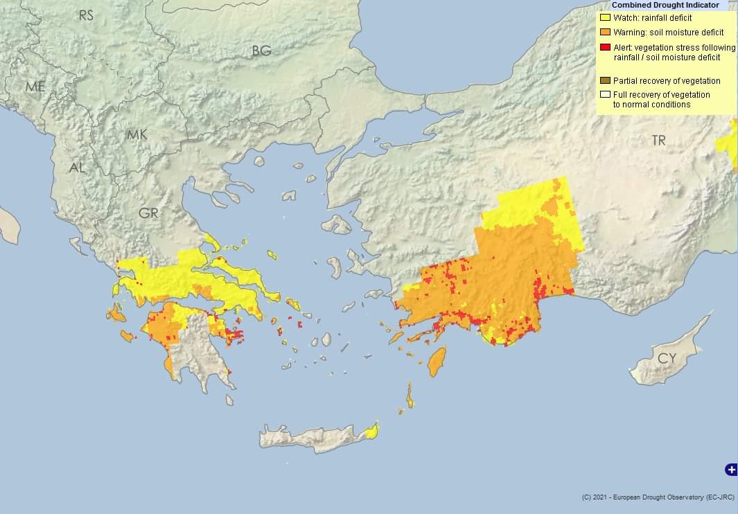 Τα εξαιρετικά χαμηλά ποσά βροχής που έπεσαν την Άνοιξη στην Ελλάδα με έμφαση την νότια, έχουν ήδη δημιουργήσει προβλήματα ξηρασίας. Σύμφωνα με το κέντρο κλιματολογίας και εδάφους της Ευρώπης, η νότια χώρα, αντιμετωπίζει ακραίες συνθήκες ξηρασίας των τελευταίων 25 ετών. Μάλιστα πολλές περιοχές βρίσκονται στο ανώτατο όριο ξηρασίας σε κόκκινο συναγερμό.