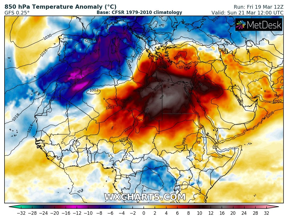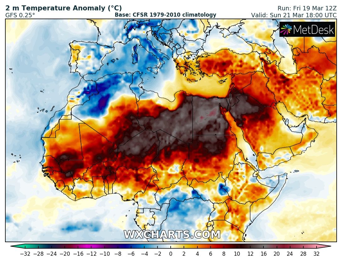 Ενα πολυ θερμο κυμα προκειται να πληξει και την βορεια Αφρικη τις επομενες μερες με την θερμοκρασια να αναμενεται να φτασει εως και τους 16 βαθμους πανω απο τα κλιματικα!