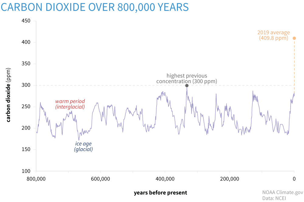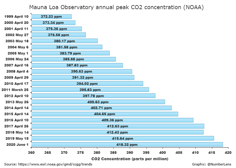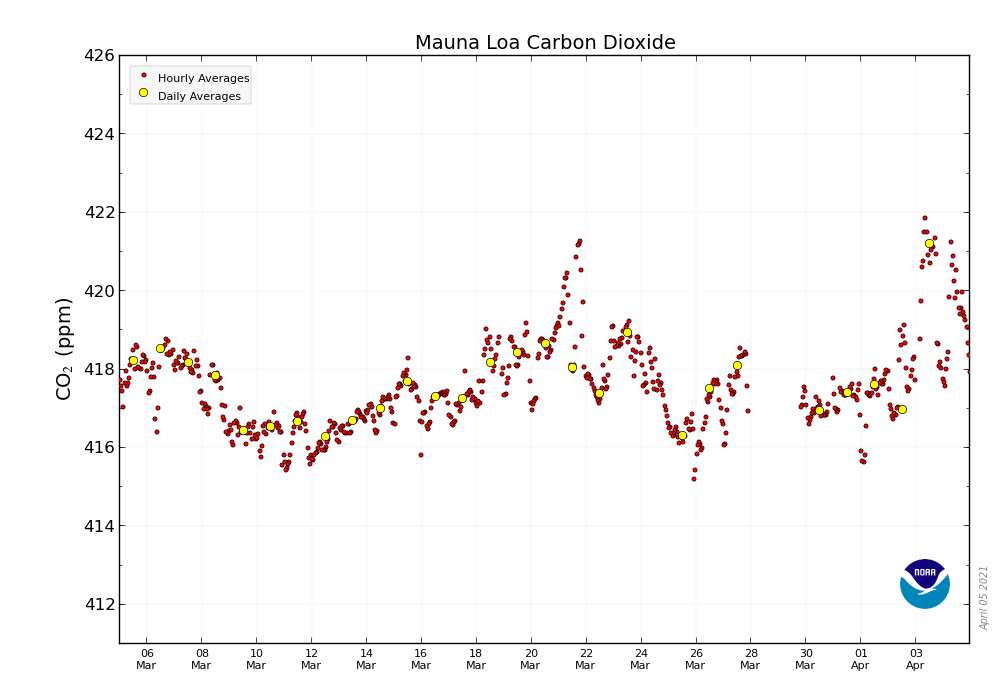 Προχθες, 3 Απριλιου 2021, η ημερησια μεση συγκεντρωση διοξειδιου του ανθρακα οπως μετρηθηκε στο διεθνες παρατηρητηριο στην Μαουνα Λοα στην Χαβαη, ξεπερασε για 1η φορα στην συγχρονη ιστορια τα 420 ppm (μερη ανα εκατομμυριο) φτανοντας τα 421.21 ppm μεσο ορο για εκεινη τη μερα.
