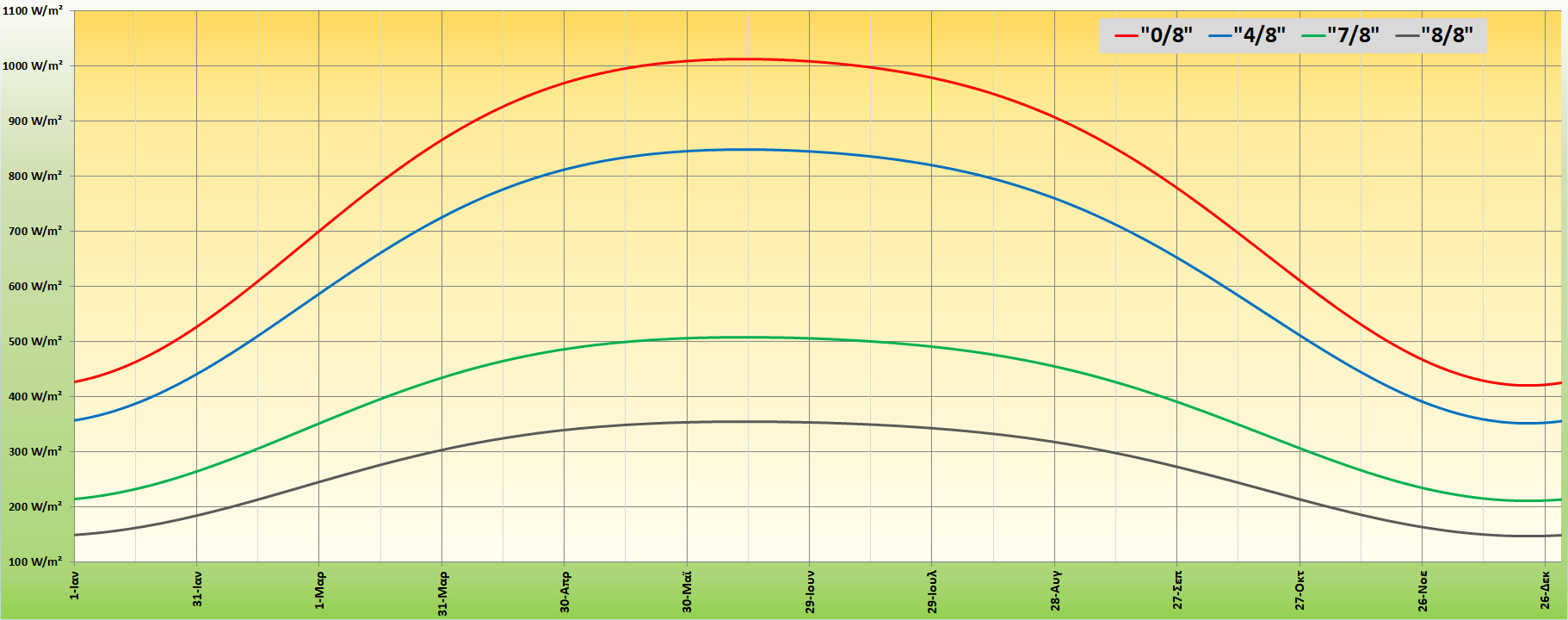 Ενω εδω βλεπουμε την ενταση της ηλιακης ακτινοβολιας για την Αθήνα για διάφορες τιμες νεφοκαλυψης(8/8 ειναι πληρης νεφωση, 0/8 πληρης ηλιοφανεια) οπου βλεπουμε οτι σιγα σιγα ο Ηλιος αναλαμβανει το δραση και εχει 2.5 φορες μεγαλυτερη ισχυ απο οτι πχ στις 1 Ιανουαριου.