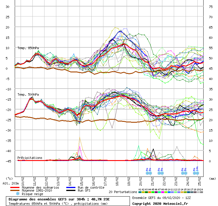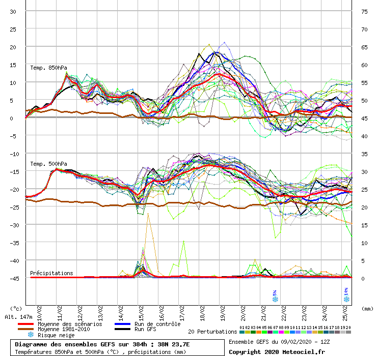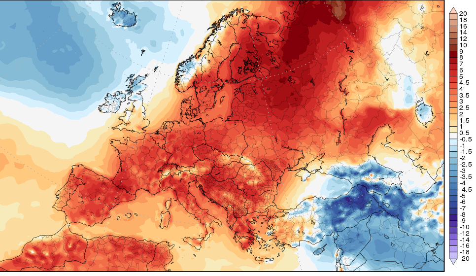 2 χαρακτηριστικα διαγραμματα της εντασης των θερμων μαζων που θα μας επισκεφτουν που δειχνουν την αποκλιση των θερμοκρασιων στα 850 hPa(που ειναι ενα αντιπροσωπευτικο στρωμα για να δειχνει την ενταση καθε θερμης εισβολης αφου την εποχη αυτη δεν επηρεαζεται απο την θερμανση λογω ηλιου) απο τις κλιματικες τιμες(πορτοκαλι γραμμη) για Θεσσαλονικη και Αθήνα.