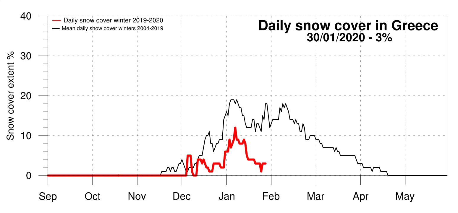 Εδω και η χιονοκαλυψη για την Ελλαδα. Εχουμε περιπου 6 φορες λιγοτερη εκταση χιονιων απο οτι την περιοδο 2004-2019.