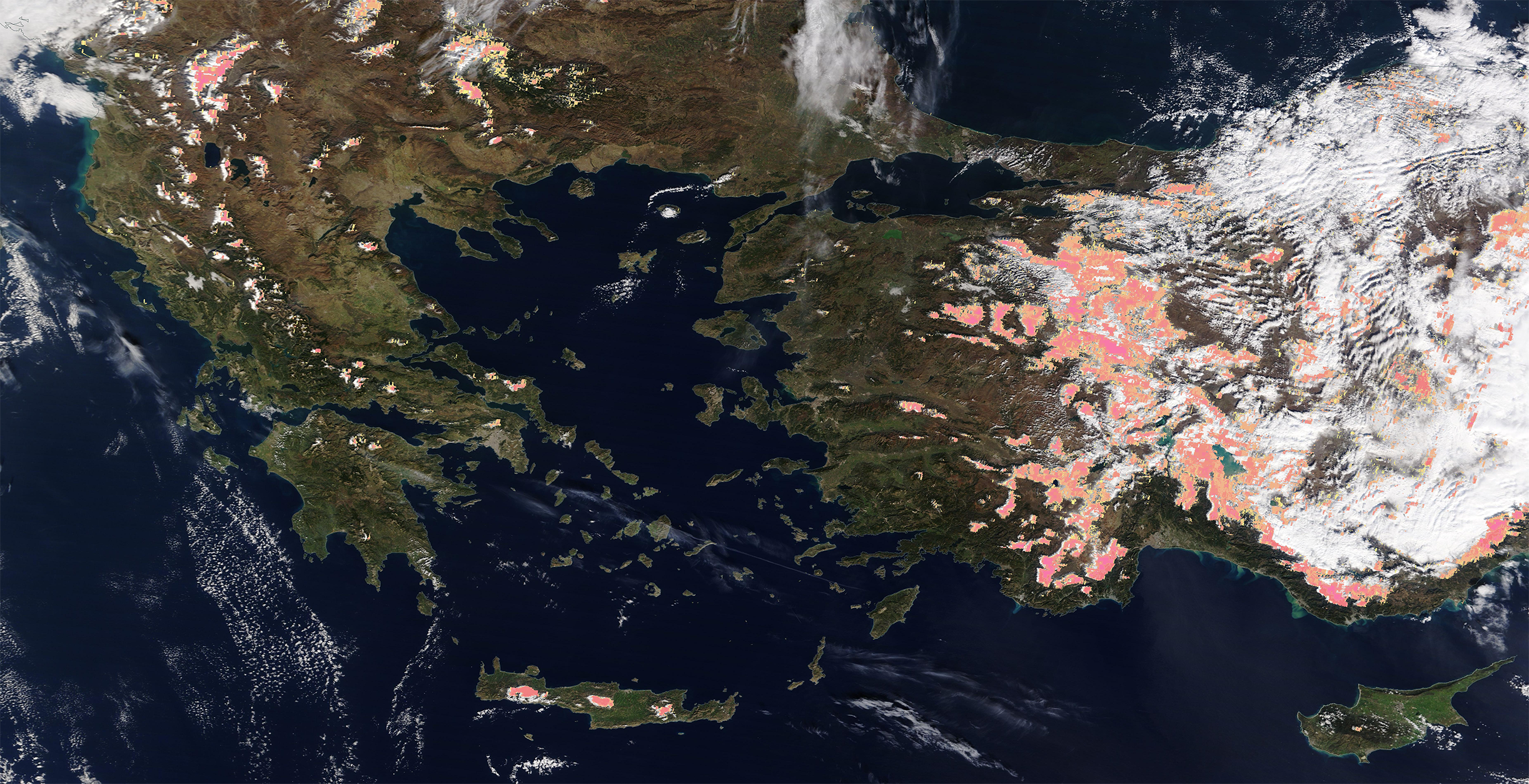 Και εδω μια δορυφορικη εικονα που δειχνει την χιονοκαλυψη στην Ελλάδα αρχες Φλεβαρη. Τα περισσοτερα μεγαλα βουνα ειναι σε πολυ κακη κατασταση, η οροσειρα της Πινδου που συνηθως(λογω μεγαλων υψομετρων και λογω του οτι τα συστηματα απο τα δυτικα σε καθε φθινοπωρο και χειμωνα ειναι αφθονα) ειναι φορτωμενη με χιονια ειναι σε παρα πολυ ασχημη κατασταση, ο Ολυμπος επισης, με εξαιρεσεις την Διρφη και τα βουνα της Κρητης.