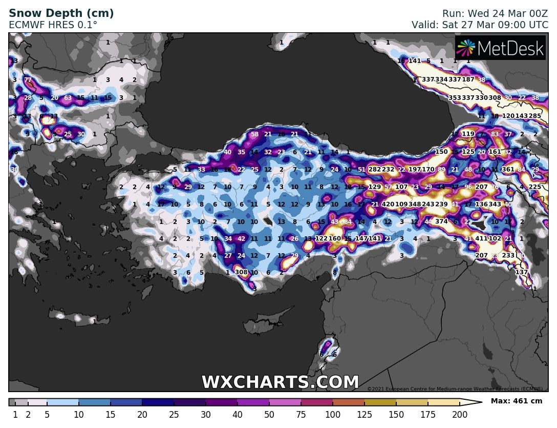 Πυκνα χιονια λοιπον θα πεσουν τις επομενες μερες στην ηπειρωτικη Τουρκια που ετσι και αλλιως βρισκεται σε ψηλα υψομετρα, σε ορεινες περιοχες δηλαδη. Ενω μεγαλα υψη χιονιου θα σημειωθουν στα ανατολικα τμηματα της Τουρκιας και ακομα περισσοτερα στον Μικρο και Μεγαλο Καυκασο.