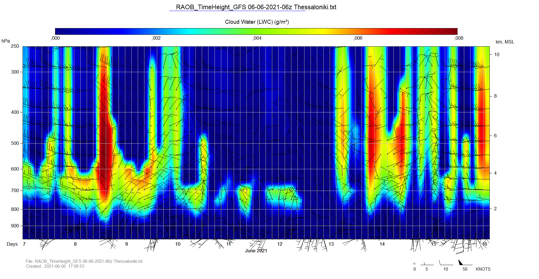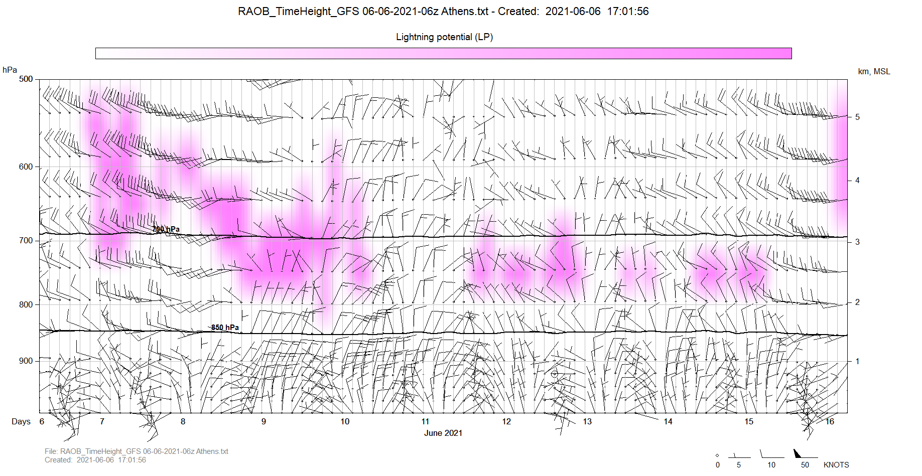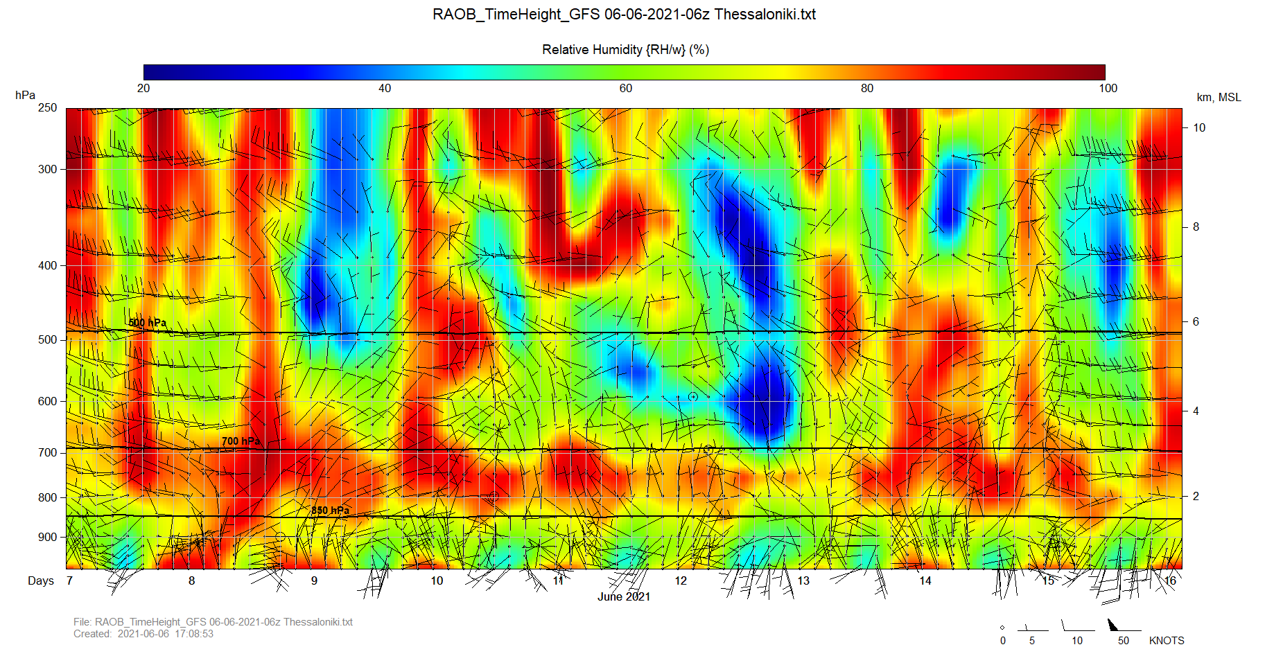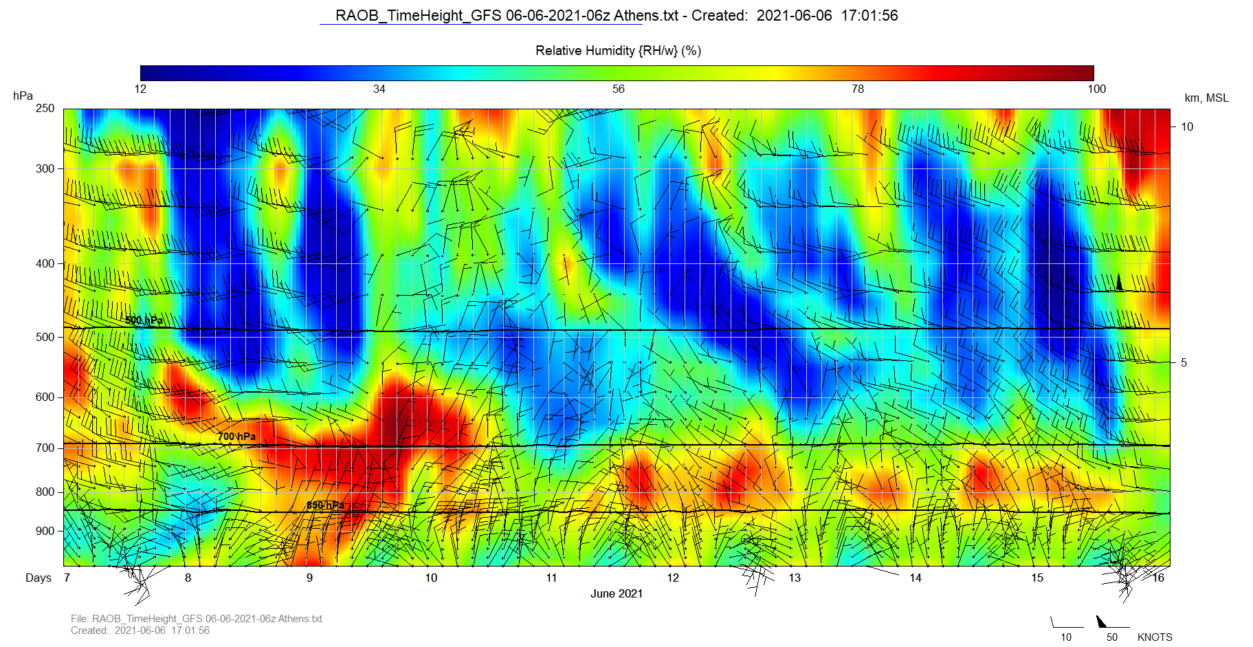 Παρακατω δινονται για Θεσσαλονικη και Αθήνα χαρτες σχετικης υγρασιας καθ’ υψος, υετισιμου υδατος νεφων, ταχυτητας και διευθυνσης ανεμων καθ’ υψος, CAPE(ασταθειας) καθ’ υψος και δυναμικου για ηλεκτρικες εκκενωσεις, για το 6z τρεξιμο του GFS.