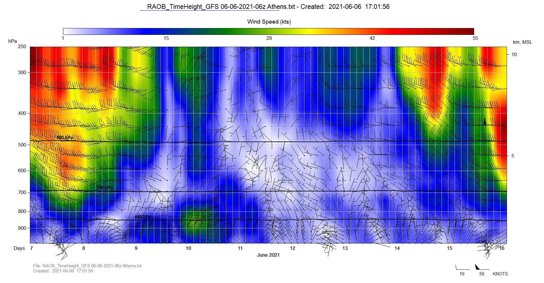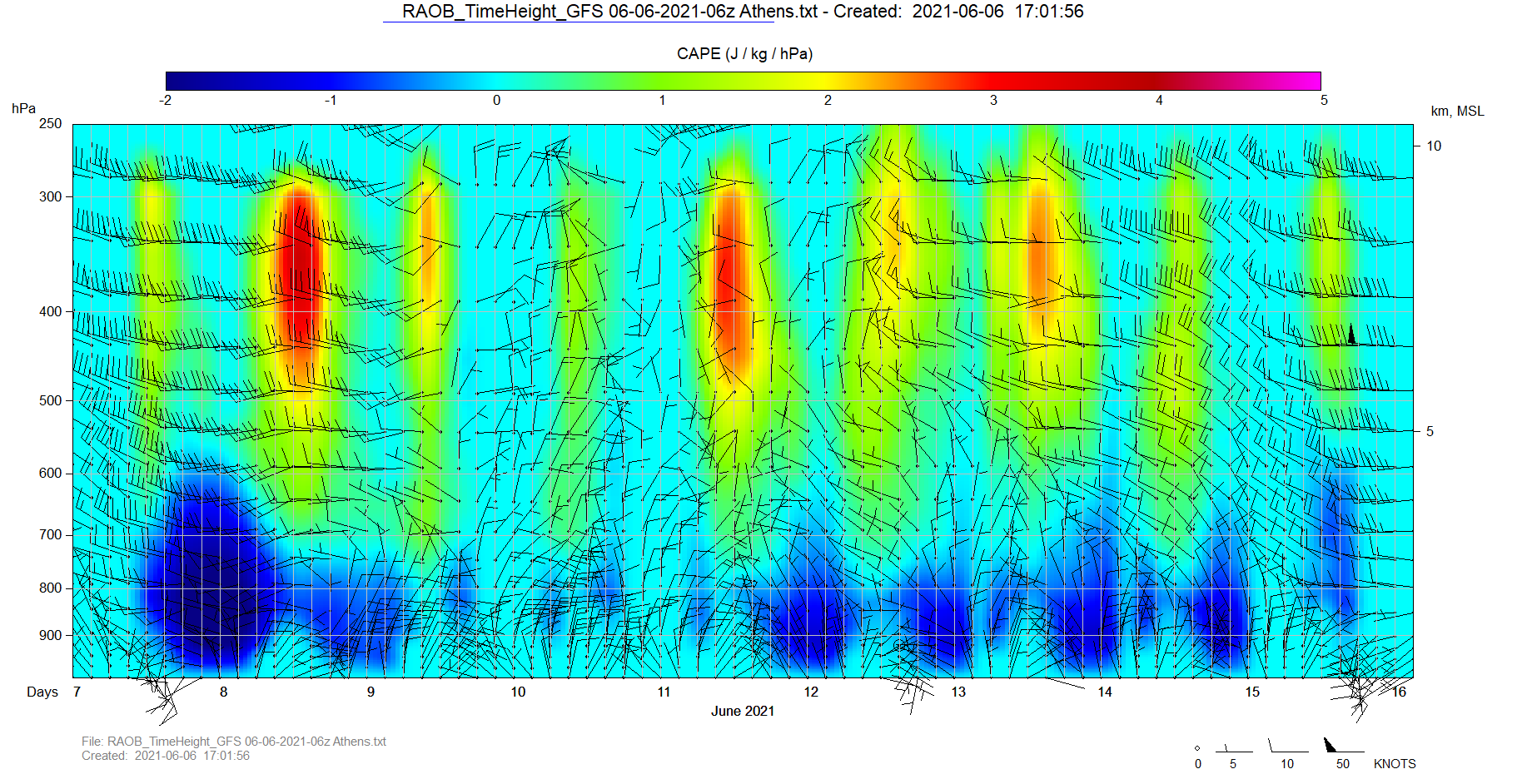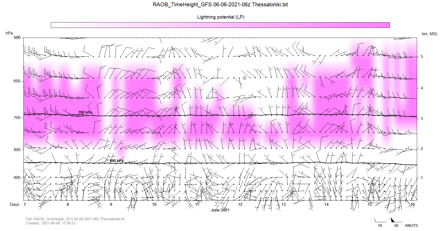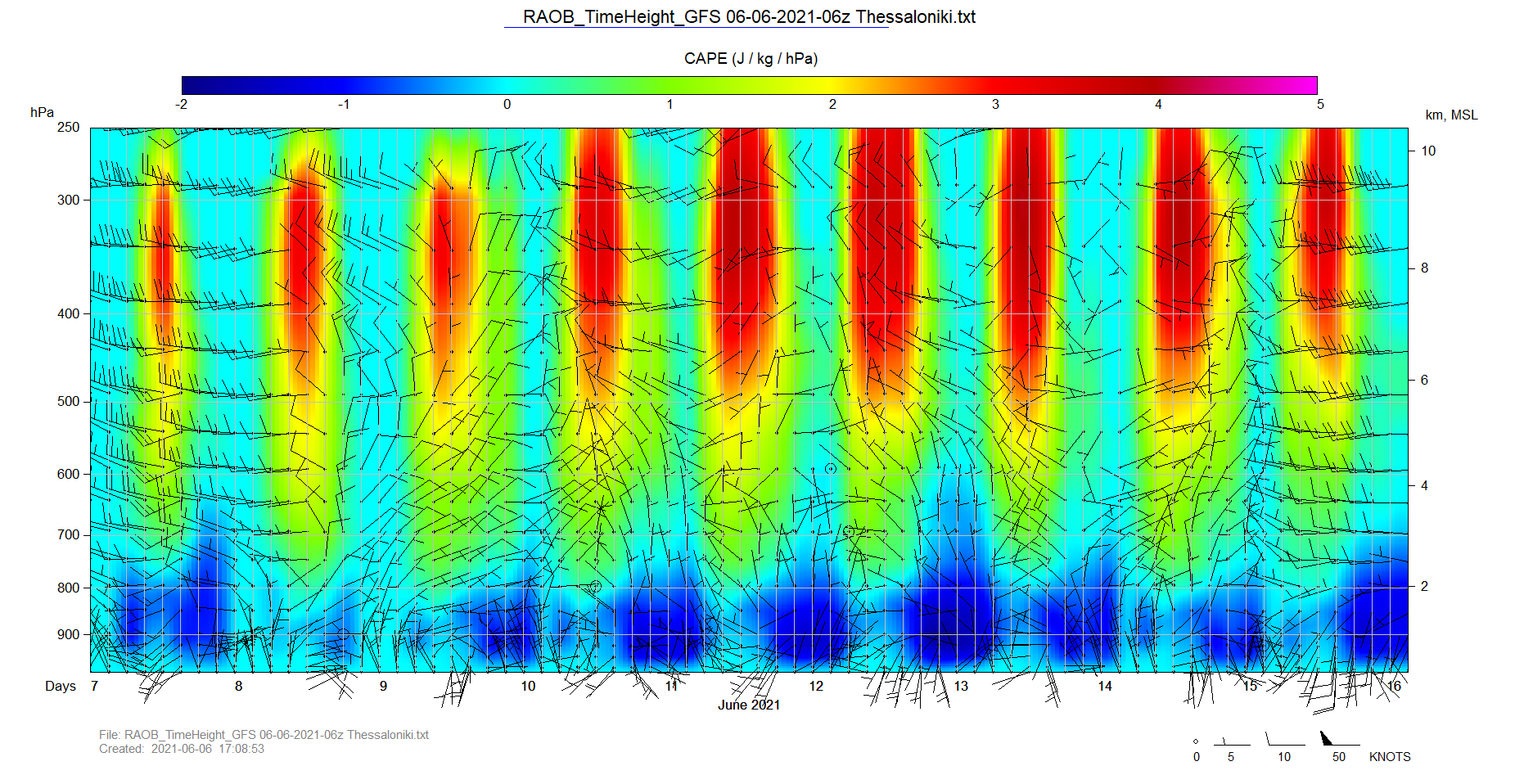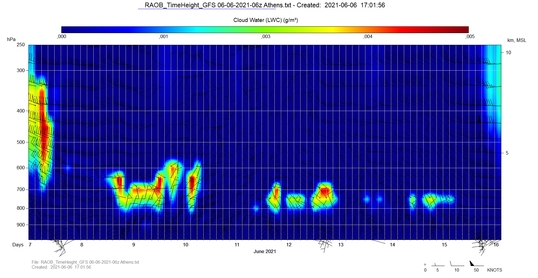 Παρακατω δινονται για Θεσσαλονικη και Αθήνα χαρτες σχετικης υγρασιας καθ’ υψος, υετισιμου υδατος νεφων, ταχυτητας και διευθυνσης ανεμων καθ’ υψος, CAPE(ασταθειας) καθ’ υψος και δυναμικου για ηλεκτρικες εκκενωσεις, για το 6z τρεξιμο του GFS.