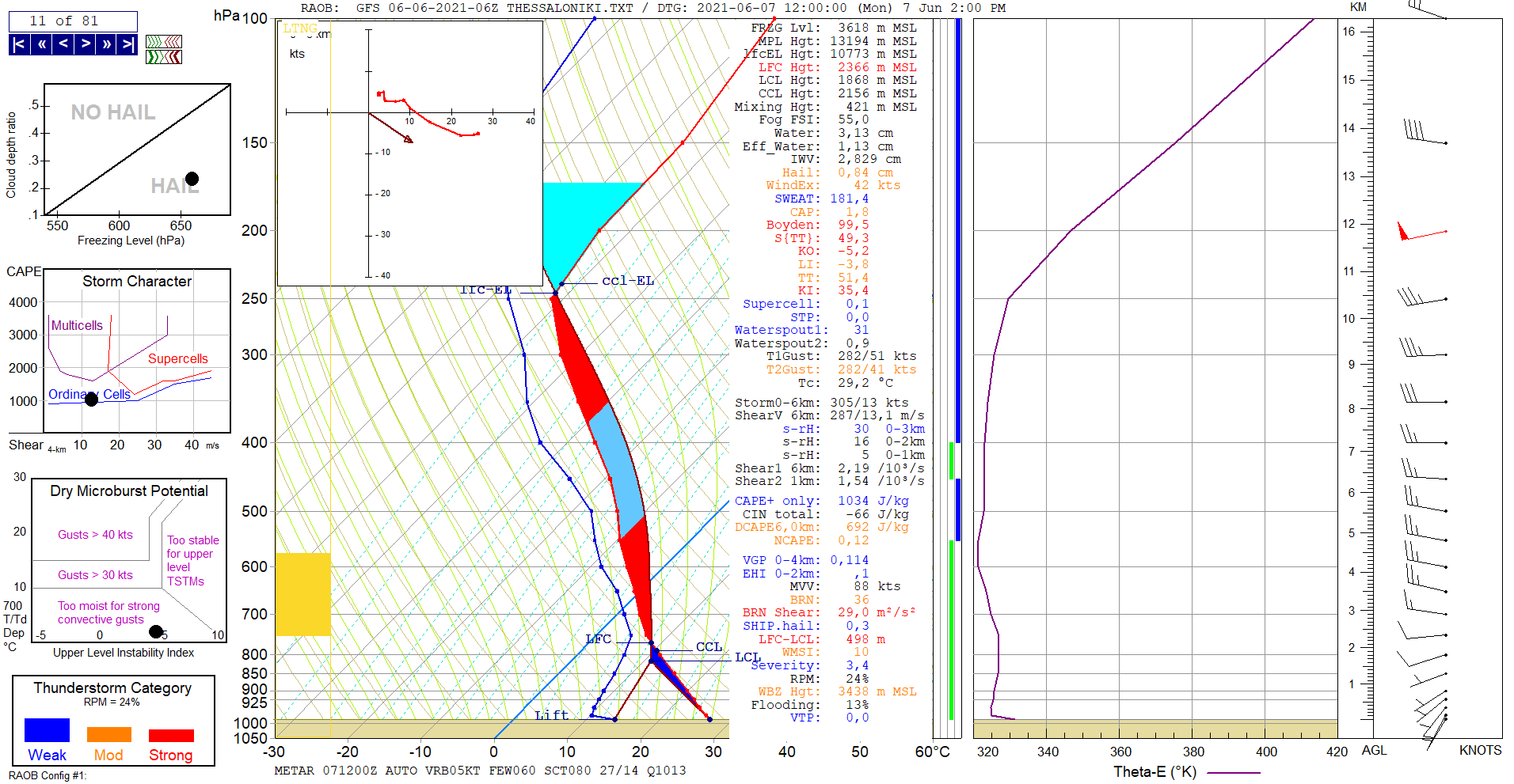 Θερμοδιαγραμμα της πολης της Θεσσαλονικης για αυριο το μεσημερι οπου η ασταθεια ειναι ικανοποιητικη και οπως γινεται συνηθως τα μοντελα υποεκτιμουν την σχετικη υγρασια κοντα στην επιφανεια για την Θεσσαλονικη οπότε και η πραγματικη τιμη του CAPE συνηθως ειναι αρκετα μεγαλυτερη απο την προβλεπομενη. Το παρον μοντελο μαλιστα του GFS εχει και μεγαλο bias υποεκτιμησης του CAPE συμφωνα και με τους ιδιους τους ανθρωπους του ΝΟΑΑ που το αναπτυσσουν.