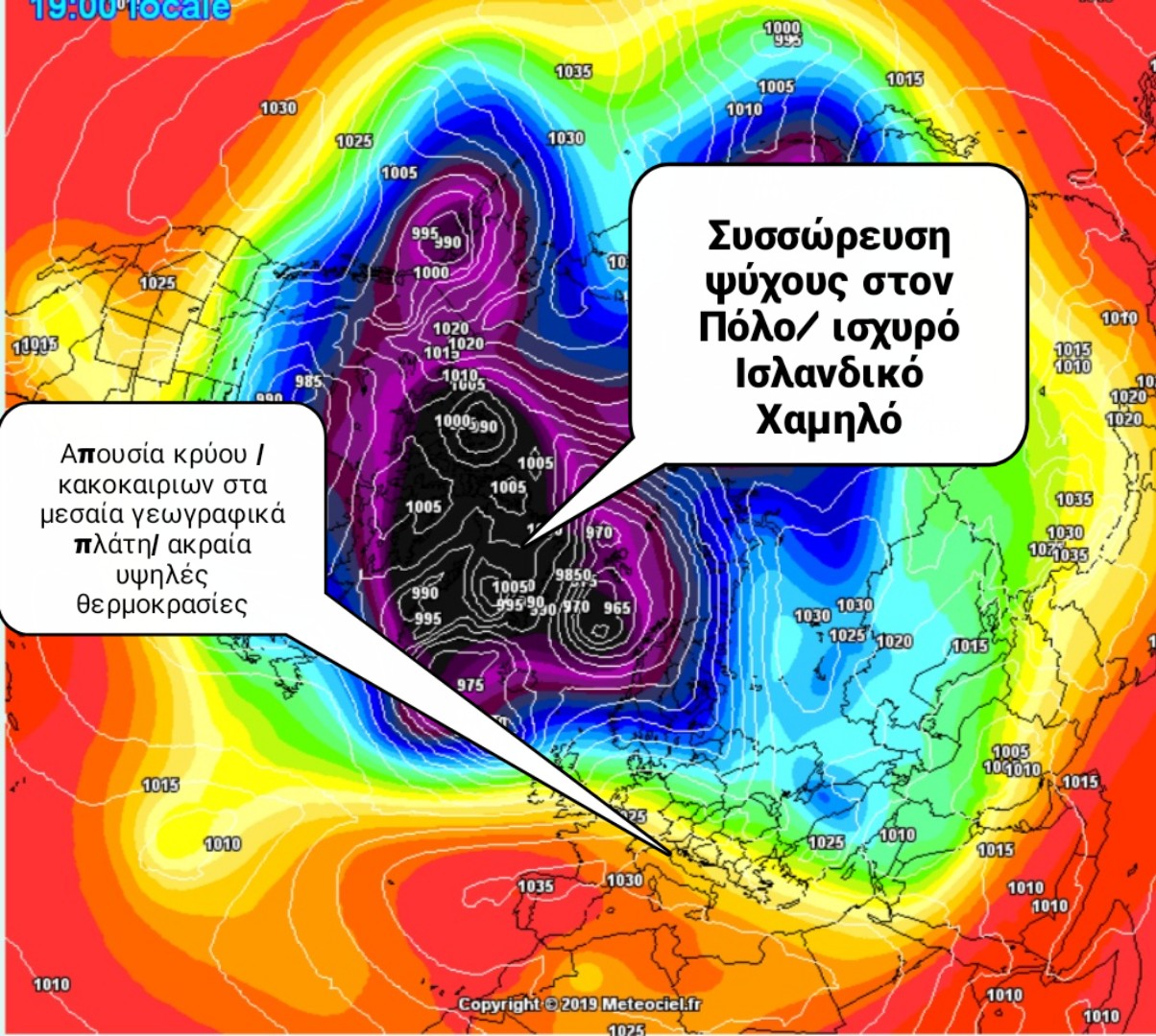 Ιδιαίτερα ανησυχητικά είναι τα δεδομένα που έχουμε στην διάθεσή μας, για την εξέλιξη του Χειμώνα από εδώ και στο εξής, και ιδιαίτερα για τον κατ εξοχήν χειμερινό μήνα, τον Γενάρη. Το σύνολο των στοιχείων, θέλουν το ψύχος – και κατ επέκταση οι χιονοπτώσεις- να ” τραβιέται” οριστικά στα μεγάλα γεωγραφικά πλάτη, και συγκεκριμένα στον βόρειο πόλο. Αυτό σημαίνει, πως υψηλές, αντικυκλωνικες πιέσεις, θα καλύψουν όλη την κεντρική και νότια Ευρώπη αλλά και την χώρα μας, οδηγώντας τον καιρό των επόμενων εβδομάδων, σε μια αλλοπροσαλη συμπεριφορά ” Άνοιξης” στην καρδιά του χειμώνα! Αξίζει μάλιστα να τονισθεί, πως η πιθανότητα να σημειωθούν χιονοπτώσεις τις επόμενες εβδομάδες ακόμη και στα ορεινά της χώρας μας, αγγίζει μετά βίας το 2% , με το πιθανότερο σενάριο, να θέλει, η χώρα μας να μπαίνει σε ένα διάστημα ασυνήθιστης καλοκαιρίας μέχρι και τα τέλη του νέου μήνα.