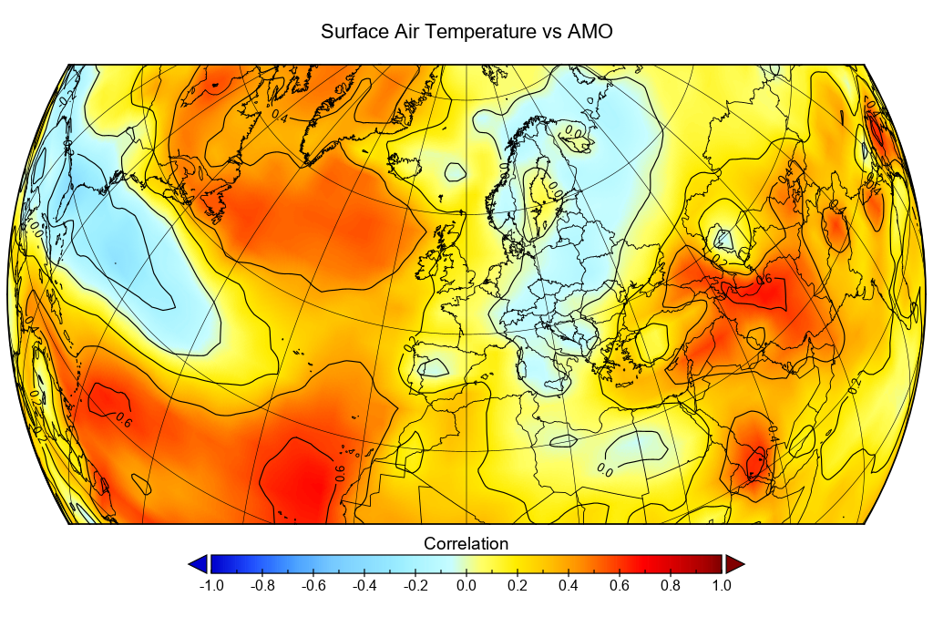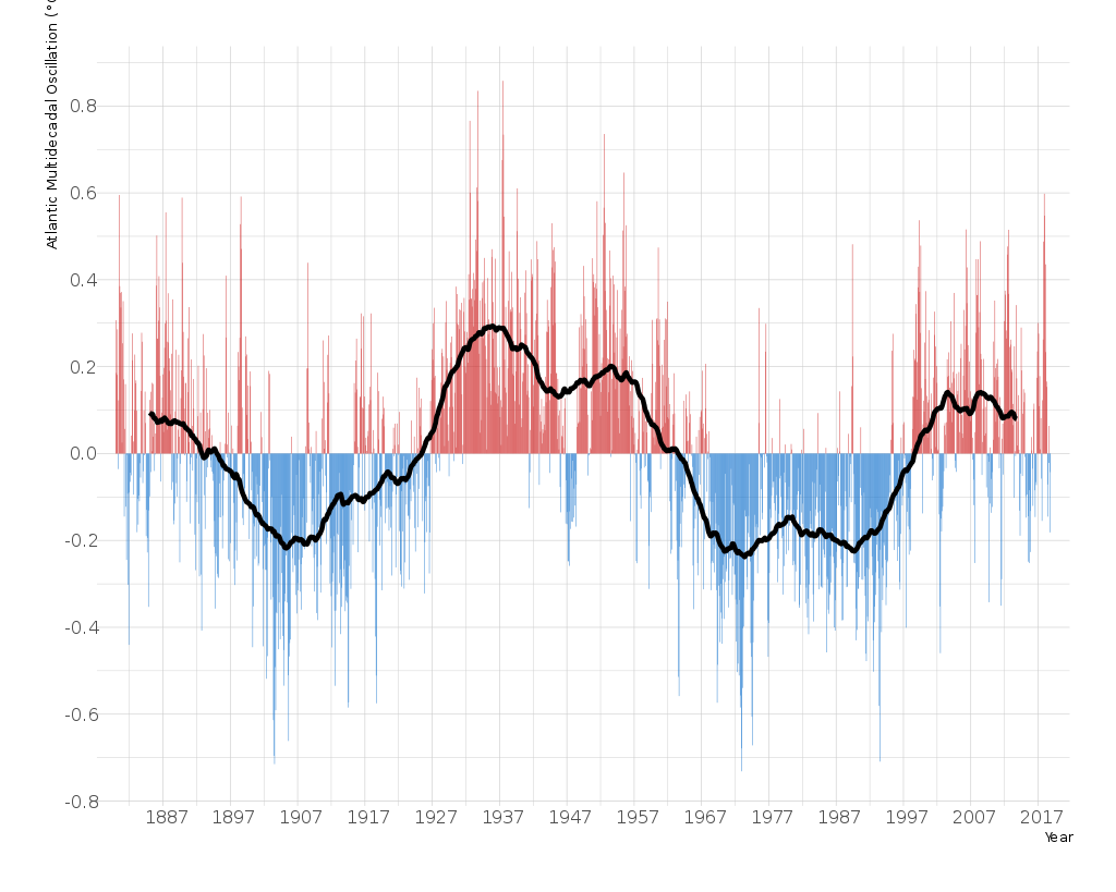 Μια ακομα σημαντικοτατη τηλεσυνδεση ειναι η πολυδεκαετης ταλαντωση του Ατλαντικου (Atlantic Multidecadal Oscillation ή AMO) και οριζεται ως η αποκλιση της μεσης τιμης των θερμοκρασιων της επιφανειας της θαλασσας στο Βορειο Ατλαντικο( 0° Ν εως 80 °Ν) απο τις κλιματικες τιμες μιας περιοδου. Και περιγραφει την ταλαντωση των ψυχρων και θερμων περιοδων του Βορειου Ατλαντικου που εναλασσονται ανα αρκετες δεκαετιες με μια μεση περιοδο 60 εως 80 ετων, ανα 30 ή 40 ετη περιπου δηλαδη πηγαινουμε απο την θερμη φαση στην ψυχρη.