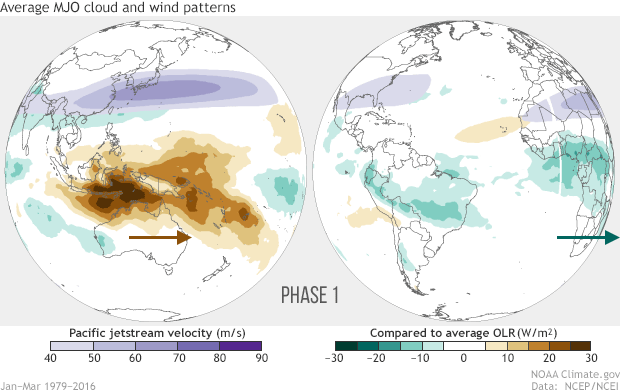 Αναλυτικοτερα στον δυτικο Ειρηνικο ωκεανο, λογω της θερμανσης του απο τα θερμα υδατα που συνηθως επικρατουν στην περιοχη, ο αερας υφισταται κατακορυφη ανυψωση και ετσι δημιουργουνται εκτεταμενες περιοχες με καταιγιδες, ενω ταυτοχρονα στο εδαφος επικρατουν χαμηλες πιεσεις.