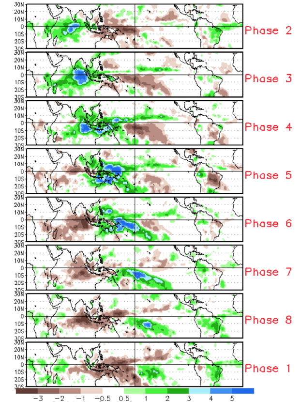 Μια αλλη τηλεσυνδεση μικροτερης χρονικης περιοδου που εχει πολυ σημαντικη συνεισφορα στην προβλεψη του υετου γυρω απο τον ισημερινο βεβαια ειναι η ταλαντωση Μαντεν-Τζουλιαν(Madden-Jullian Oscillation ή MJO) εχοντας εναν κυκλο 2 με 3 μηνες. Διακρινεται σε 8 φασεις και εχει βρεθει πχ οτι κατα την καθοδο της φασης του MJO οι τυφωνες στον Ειρηνικο ωκεανο ειναι 6 φορες πιο συχνοι.