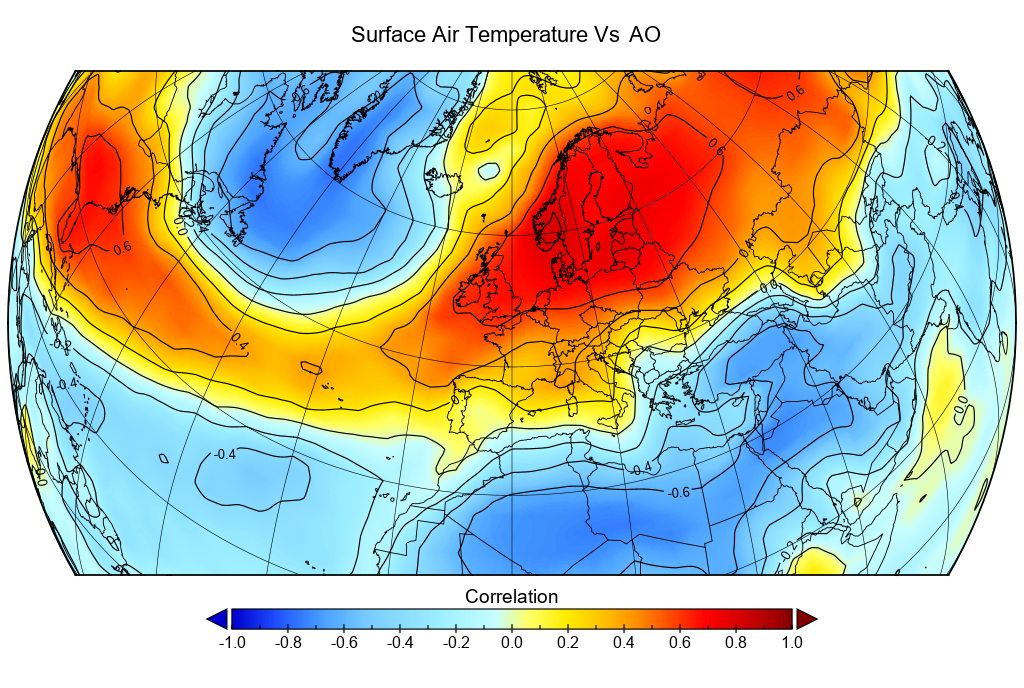 Ενω και σε ολη την βορεια αλλά και κεντρικη Ευρωπη υπαρχει ισχυροτατη συσχετιση του ΑΟ με τις θερμοκρασιες των περιοχων.