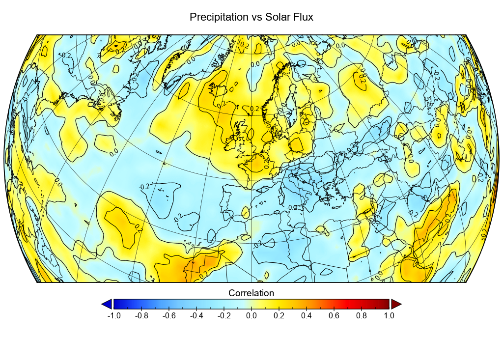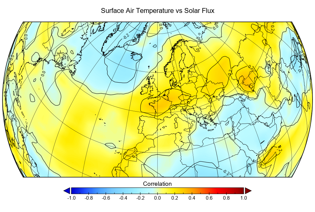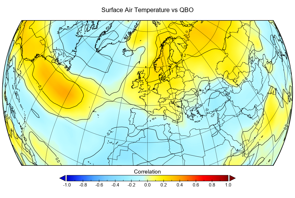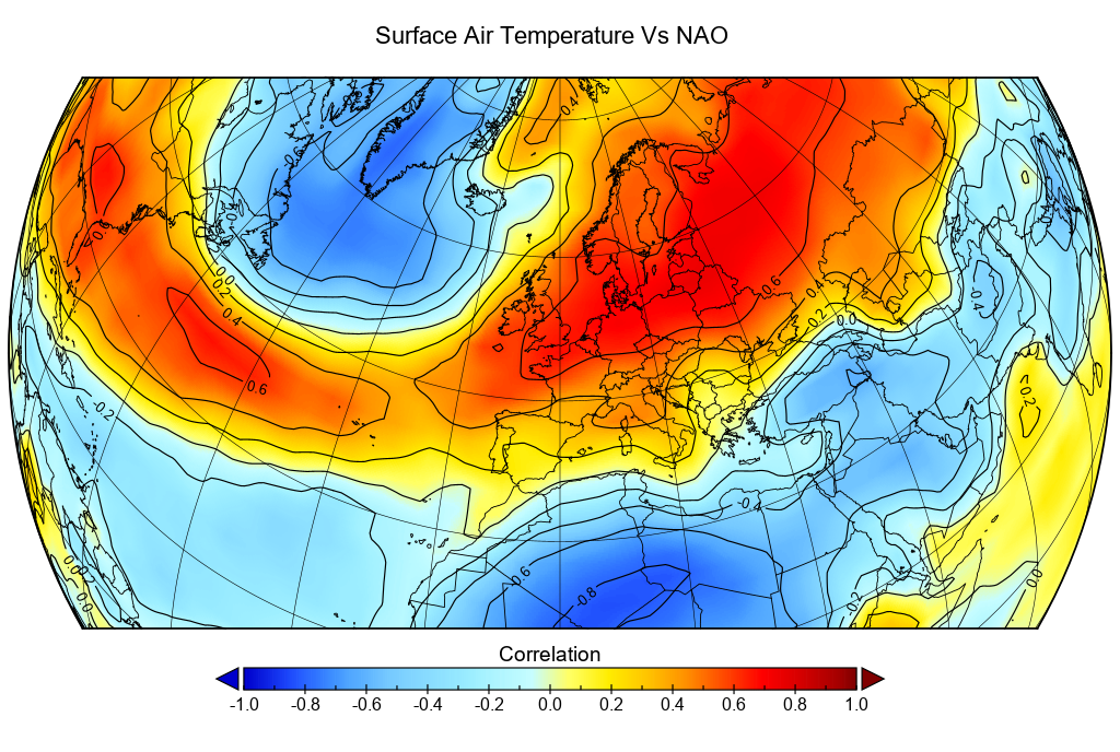 Αντιθετα σε ολη την βορεια αλλά και κεντρικη Ευρωπη υπαρχει ισχυροτατη συσχετιση του ΝΑΟ με τις θερμοκρασιες των περιοχων εκει αλλά οσον αφορα την βορεια Ευρωπη και με τον υετο που πεφτει.