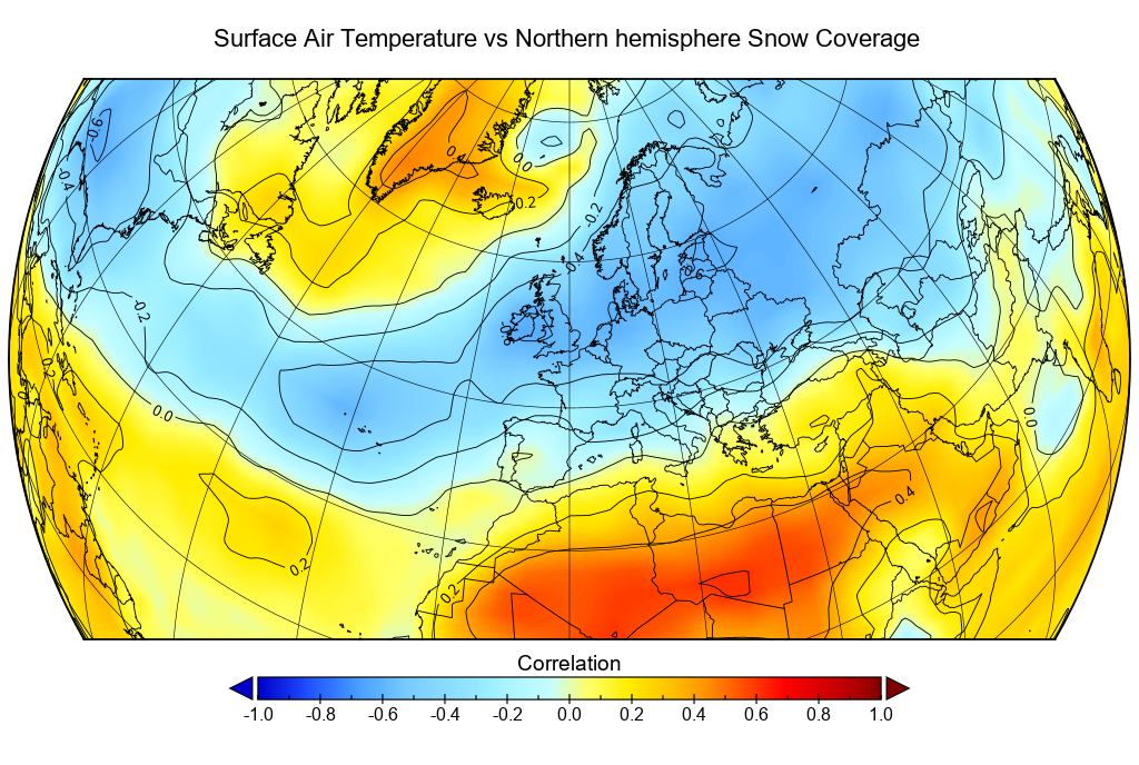 Αντιθετα η συσχετιση χιονοκαλυψης του βορειου ημισφαιριου με τις θερμοκρασιες δεν ειναι και τοσο ιδιαιτερη για την Ελλαδα, σε αντιθεση με την κεντρικη και βορεια Ευρωπη και φυσικα την βορεια Ασια που εχουν καποια αρνητικη συσχετιση, αφου προφανως αυξημενη χιονοκαλυψη σημαινει και μικροτερη θερμοκρασια για την βορεια Ασια.