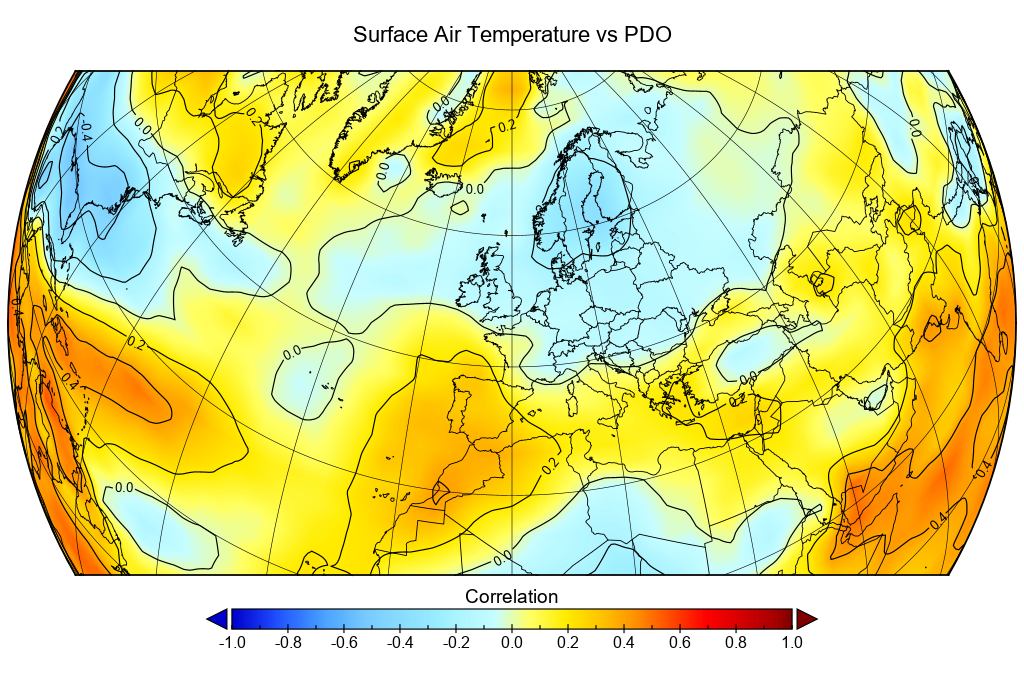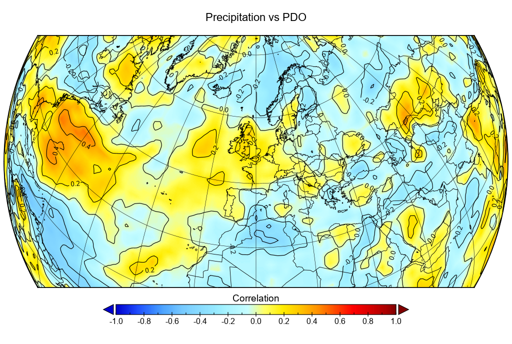 Θετικη συσχετιση σημαινει οτι οσο ανεβαινει ο PDO τοσο ανεβαινει και ο υετος ή η θερμοκρασιες για την εν λογω περιοχη.