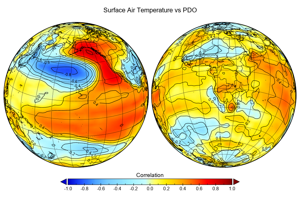Ο δεικτης PDO γινεται θετικος οταν οι θερμοκρασιες στα βορειοδυτικα του Ειρηνικου ειναι αρνητικες και οι θερμοκρασιες στα ανατολικα των τροπικων περιοχων του Ειρηνικου ειναι θετικες, ενω γινεται αρνητικος στην αντιστροφη περιπτωση.