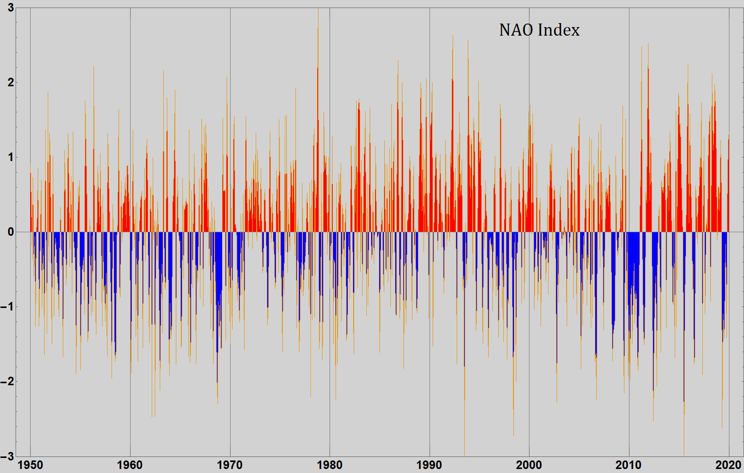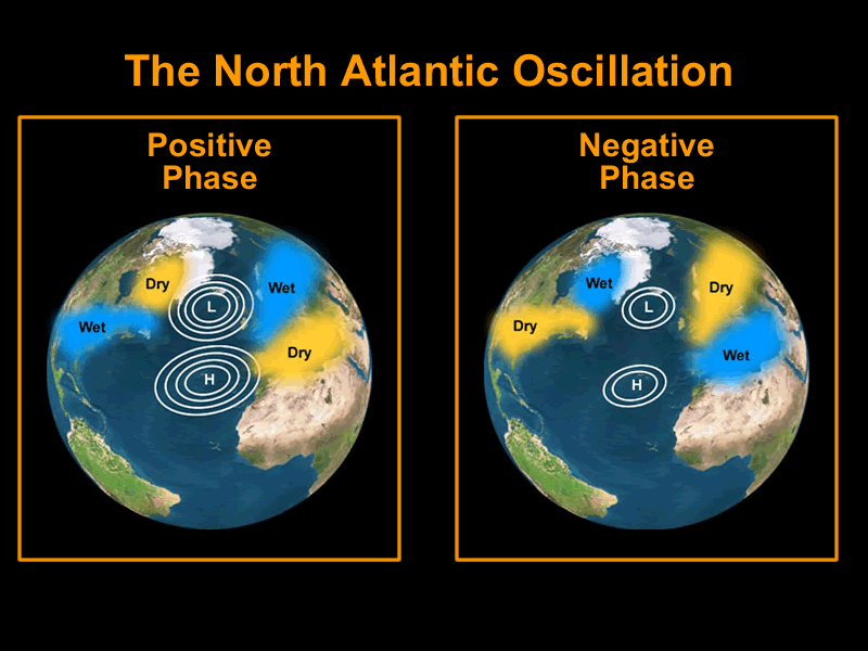 Οταν η διαφορά της ατμοσφαιρικής πιεσης μεταξυ Ισλανδιας και Αζορων ειναι μικροτερη απο ενα συγκεκριμενο κατωφλι που εχουμε ορισει, τοτε οριζουμε εναν δεικτη γνωστο ως δεικτη του ΝΑΟ οπου και τον οριζουμε ως αρνητικο. Οταν η διαφορά της ατμοσφαιρικής πιεσης μεταξυ Ισλανδιας και Αζορων ειναι μεγαλυτερη απο ενα συγκεκριμενο κατωφλι που εχουμε ορισει, τοτε ο δεικτης του ΝΑΟ οριζεται ως θετικος.