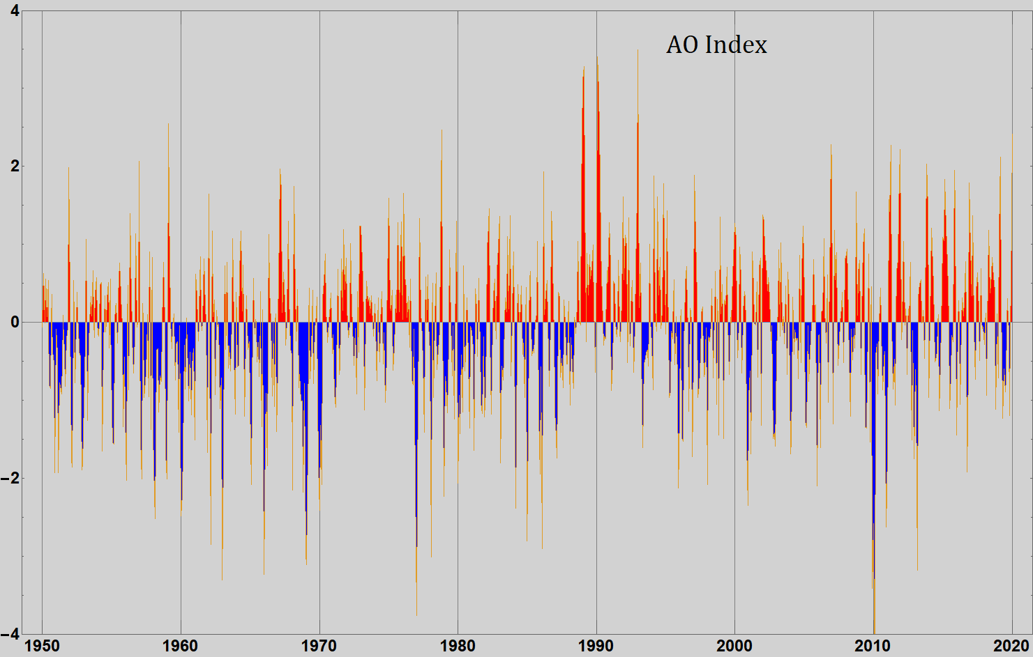 Και οπως και για τον ΝΑΟ εξαγεται και εγω ενας δεικτης ΑΟ μεσω της μετρηθεισας διαφοράς των πιεσεων που δειχνει την φαση της ταλαντωσης και παιρνει θετικες τιμες οταν αυξημενες τιμες πιεσης σε σχεση με τον μεσο όρο υπαρχουν στις 45° Ν, ενω μικροτερες απο το κανονικο στον Β.Πολο. Ενω αντιστοιχα ο δεικτης ΑΟ παιρνει αρνητικες τιμες οταν αυξημενες τιμες πιεσης σε σχεση με τον μεσο όρο υπαρχουν στον Β.Πολο ενω μικροτερες απο το κανονικο στις 45° Ν.
