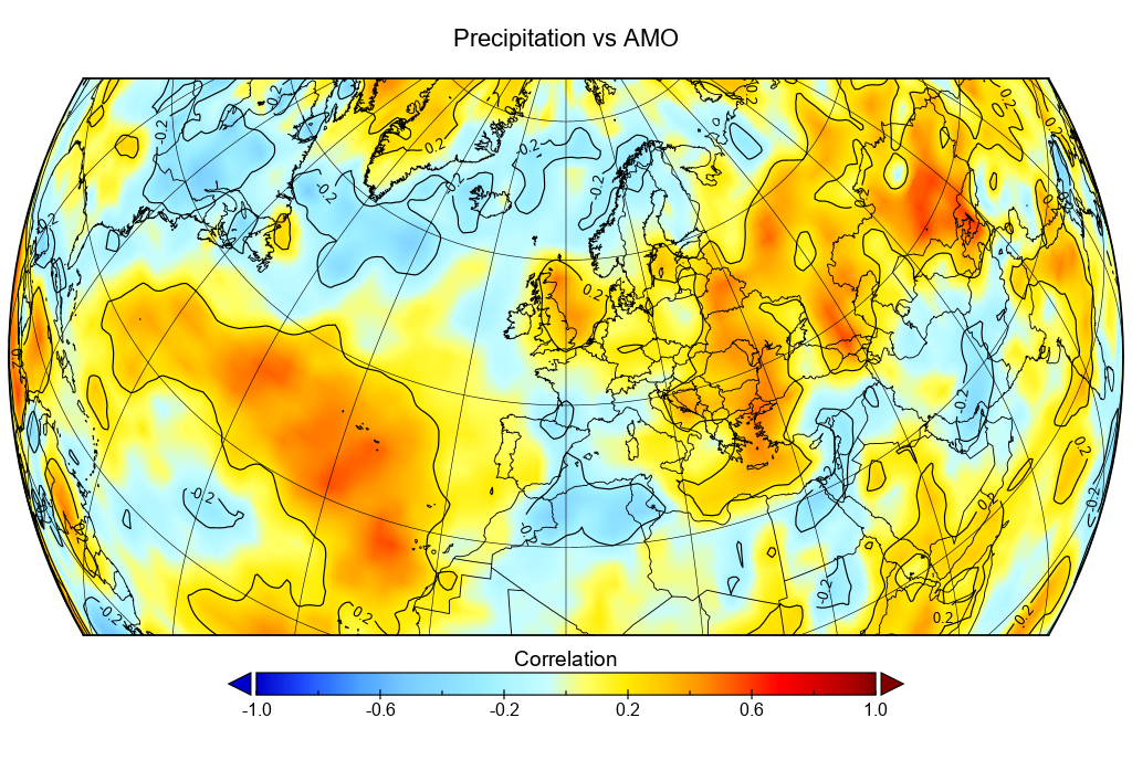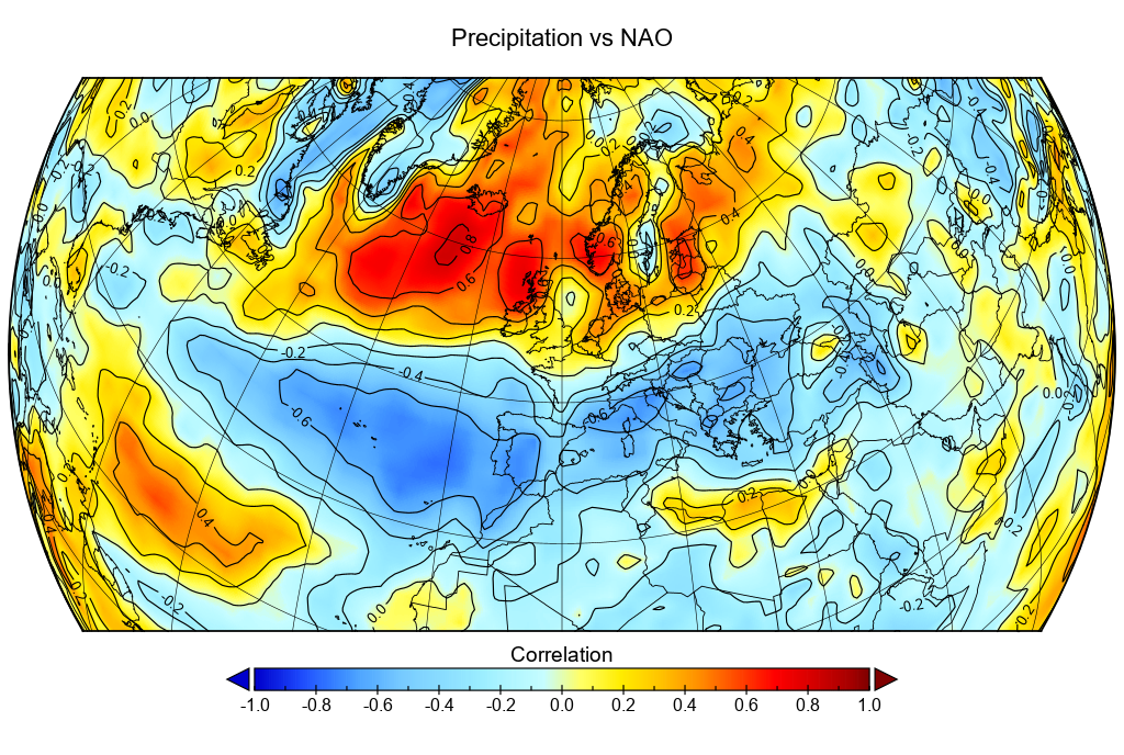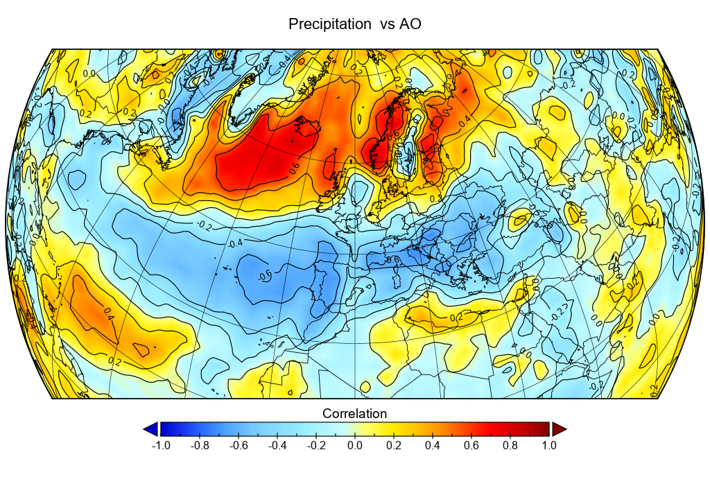 Ομως η συσχετιση του ΑΟ με τον υετο στην βορεια Ευρωπη ειναι μικροτερη απο οτι ηταν για τον ΝΑΟ, με την Νορβηγια να παρουσιαζει πολυ ισχυρη συσχετιση.