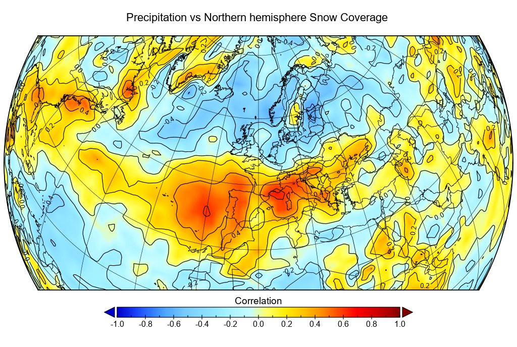 Θετικη συσχετιση σημαινει οτι οσο ανεβαινει η χιονοκαλυψη στο βορειο ημισφαιριο τοσο ανεβαινει και ο υετος ή η θερμοκρασιες για την εν λογω περιοχη.
