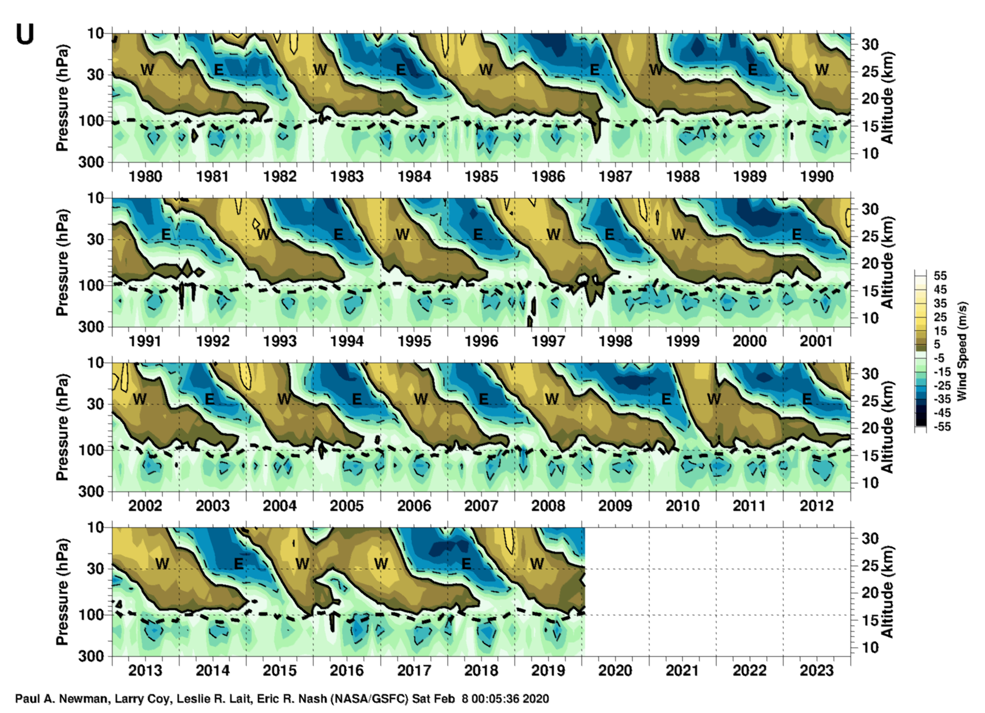 Το πλατος που συμβαινει η QBO ειναι περιπου σταθερο και ειναι μεταξυ των σταθμων 50 hPa και 10 hPa της στρατοσφαιρας και εξασθενει η ταλαντωση ταχυτατα κατω απο τα 50 hPa.