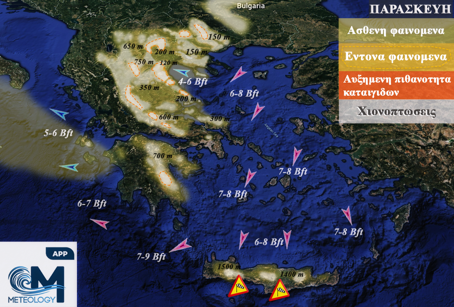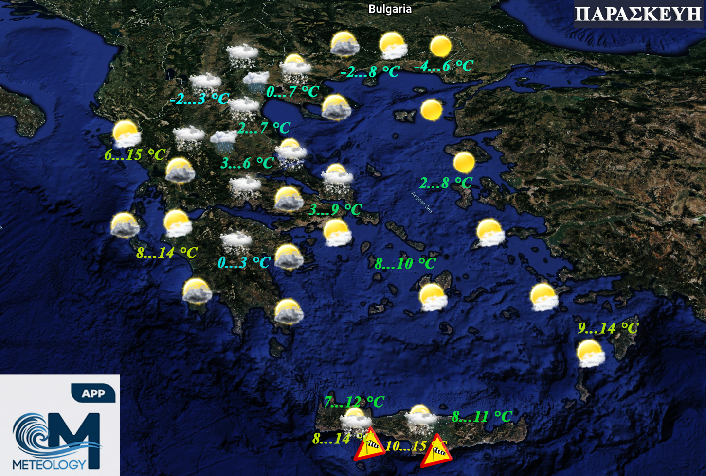 Στον παρακάτω χάρτη, αποτυπώνεται η κατανομή φαινομένων μέσα στην Παρασκευή. Τσουχτερό το κρύο ιδιαίτερα στις περιοχές με τα φαινόμενα. Μακεδονία, Θεσσαλία, Στερεά, Εύβοια και τμήματα της ανατολικής Πελοποννήσου όπως και η Κρήτη, θα έχουν μέσα στην Παρασκευή τοπικές βροχές και κάποιες χιονοπτώσεις στα αναγραφόμενα υψόμετρα. Πρόσκαιρα θα χιονίσει τις πρωινές ώρες και σε πεδινά της κεντρικής Μακεδονίας. Στην υπόλοιπη χώρα, δεν αναμένεται καμία ουσιαστική μεταβολή στον καιρό, ενώ εκτός επιροής ψυχρής εισβολής, θα παραμείνει η δυτική Ελλάδα, στην οποία θα έχουμε και τις υψηλότερες θερμοκρασίες αύριο αλλά και το Σάββατο, συγκριτικά με την ανατολική χώρα.