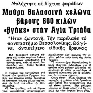 Το κήτος της θαλάσσιας χελώνας λέγεται ότι οι παράκτιοι αλιείς του κόλπου της Θεσσαλονίκης το συναντούσαν για καιρό ακόμα.