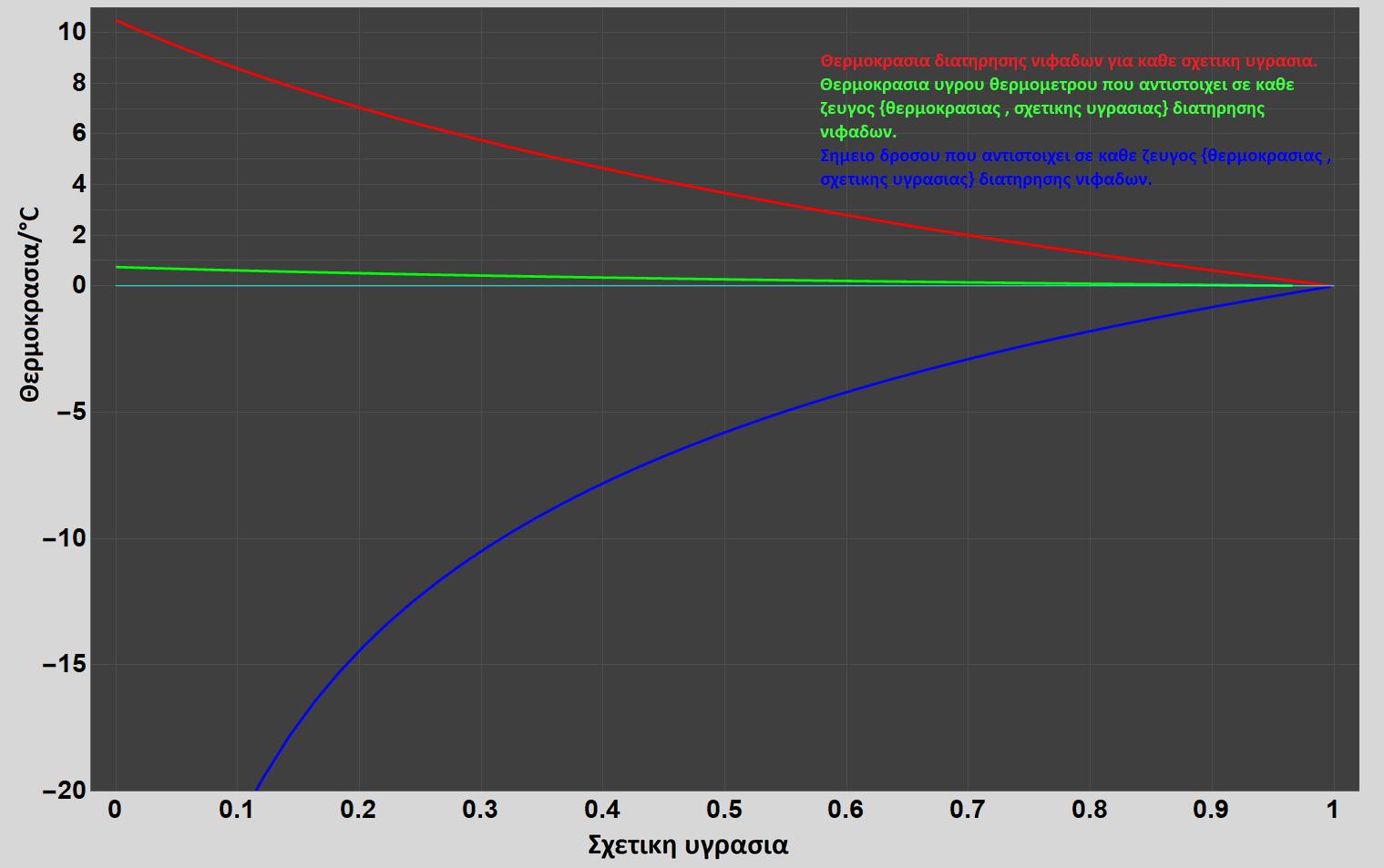 Ετσι λοιπον καταληγουμε στην εξισωση συνθηκων διατηρησης της νιφαδας για θερμοκρασια σε βαθμους Κελσιου Τ και σχετικη υγρασια Η: