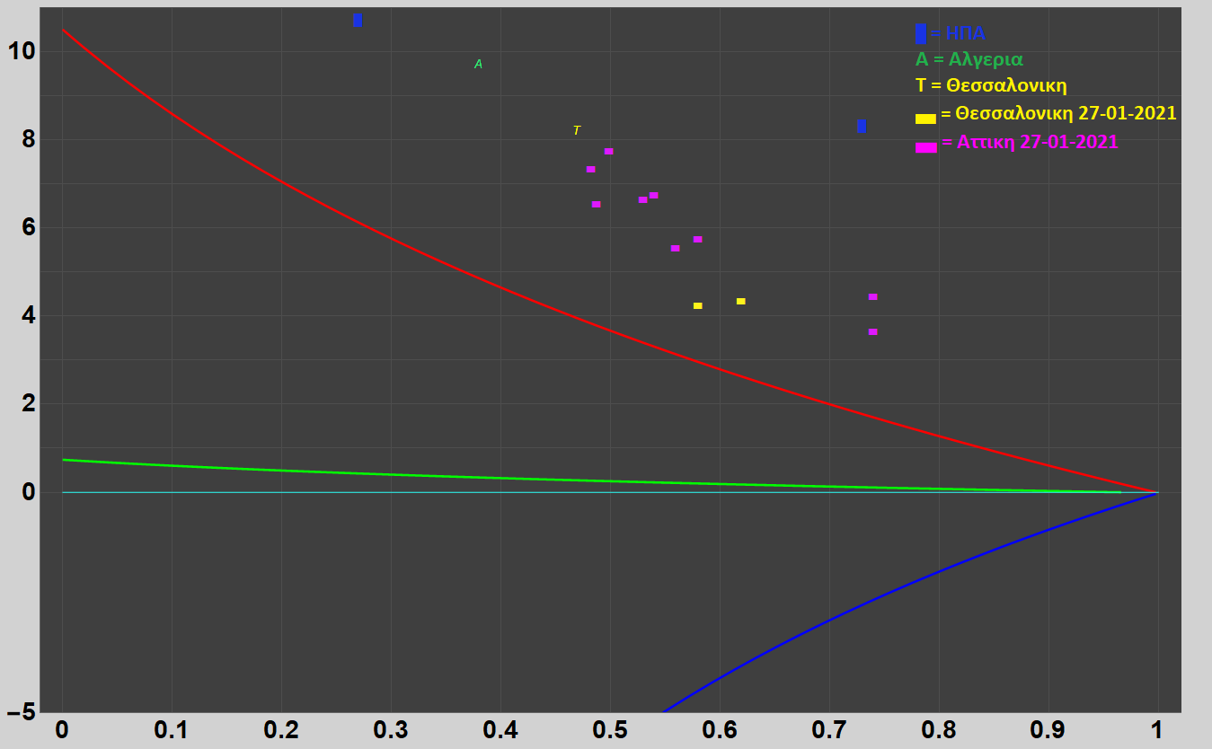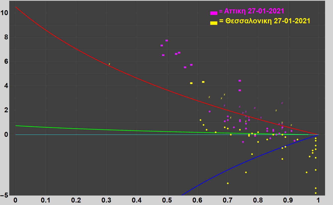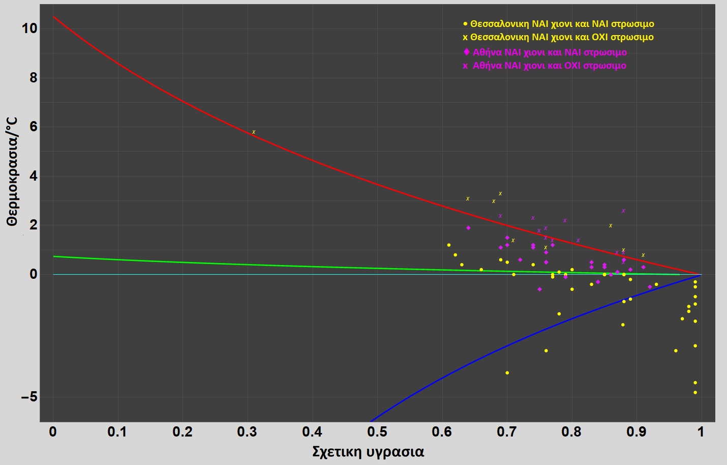 Να δουμε τωρα και το ιδιο διαγραμμα οπου προστεθηκαν και οι παρατηρησεις(ζευγαρια θερμοκρασια-σχετικης υγρασιας) χιονοπτωσης για 27 Γεναρη του 2021 για Αττικη και Θεσσαλονικη.