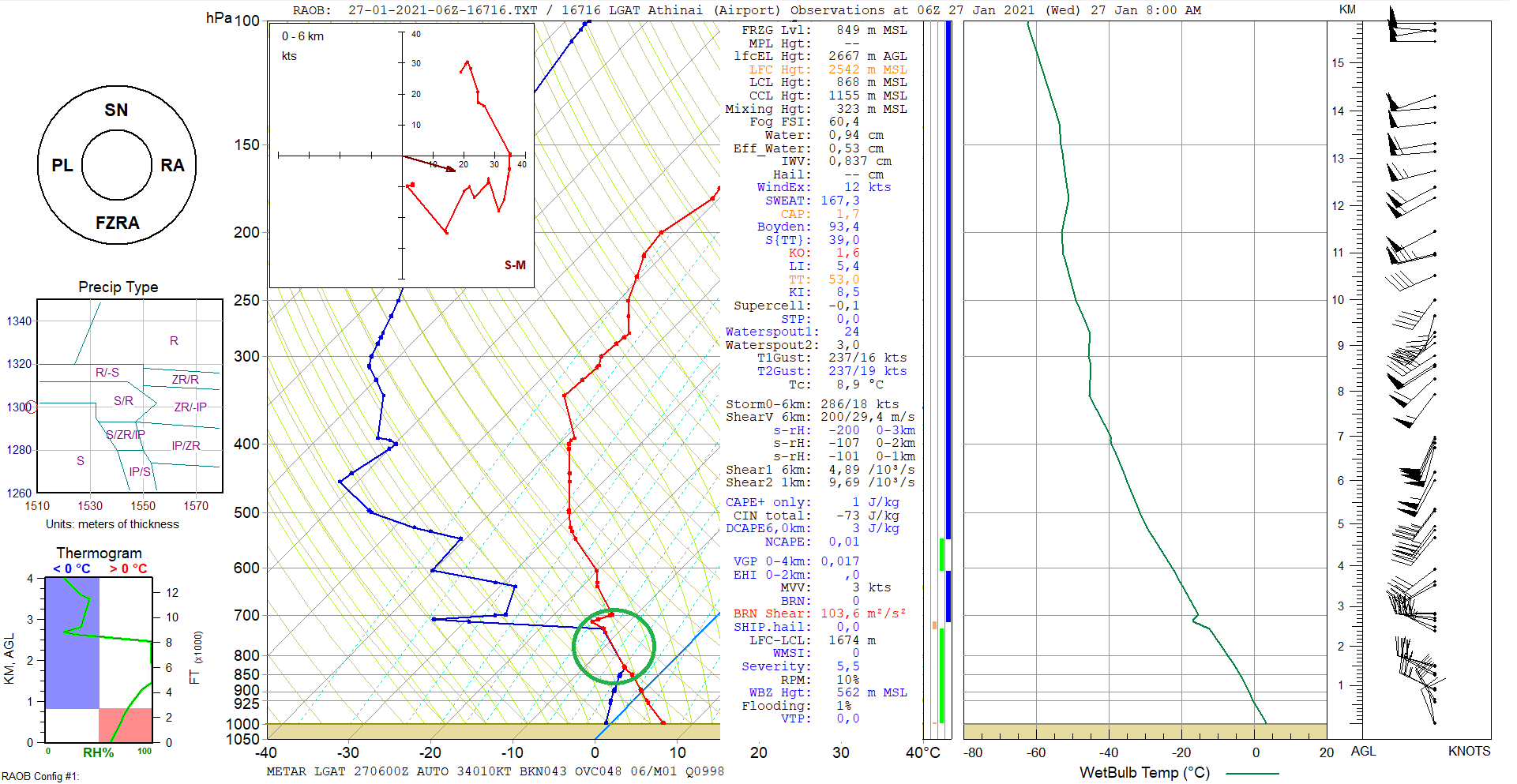 Το Skew-T της ραδιοβολησης οπου εχει σημειωθει με πρασινο κυκλο το κορεσμενο στρωμα: