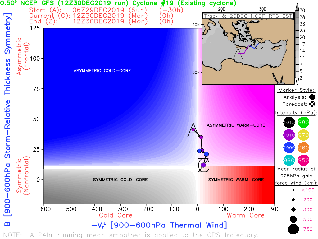Το δε χαμηλό με κέντρο περίπου την Ρόδο, δεν ήταν έναν μια από τις κλασικές χειμωνιάτικες μετωπικές υφέσεις αλλά είχε και τροπικά χαρακτηριστικά μάλλον όπως δείχνει η ανάλυση των R. Ηart και J. Εvans, αφού είχε θερμό πυρήνα, ήταν τύπου Medicane δηλαδή “κουβαλώντας” όμως και μέτωπα μαζί του: