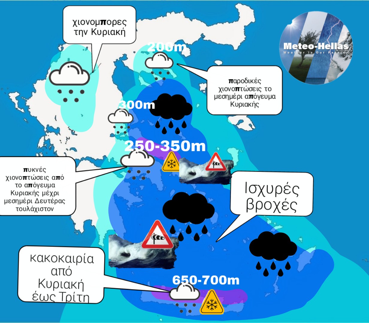 Πάμε να δούμε αναλυτικά, μέσω του χάρτη, την χρονική και γεωγραφική κατανομή των φαινομένων και της πορείας του Ηφαιστίωνα. Η είσοδος της κακοκαιρίας, γίνεται από τα βόρεια, το μεσημέρι Κυριακής. Έτσι, σε Μακεδονία και Θράκη, θα δούμε να συννεφιαζει πρόσκαιρα και θα σημειωθούν παροδικές χιονοπτώσεις στην δυτική Μακεδονία για λίγες ώρες. Πενιχρή χιονόστρωση θα επιτευχθεί κατά τόπους. Παράλληλα, ισχυρός Βαρδάρης έως 7 μποφόρ στην κεντρική Μακεδονία, προς το απόγευμα ΒΑ άνεμοι θυελλώδεις σε Θράκη. Από το απόγευμα και μετά, τα φαινόμενα θα σταματήσουν παντού και θα εστιάζονται Χαλκιδική, οπότε και θα έχουμε χιονοπτώσεις πάνω περίπου από τα 300-400μ. Στο Αιγαίο και τα ανατολικά ηπειρωτικα, η κακοκαιρία ξεκινάει από το απόγευμα Κυριακής με βροχές στα πεδινά και χιόνια στα ψηλότερα, τα οποία προοδευτικά θα κατεβαίνουν στα αναγραφόμενα υψόμετρα του χάρτη, προς την Δευτέρα. Σφοδροί άνεμοι ΒΑ διευθύνσεων σε επίπεδο θύελλας. Στο επίκεντρο η Κρήτη, με πολύ μεγάλα ύψη βροχής αλλά και χιονιου στα ψηλότερα. Στο ανατολικό Αιγαίο, οι βροχές θα εστιάζονται κυρίως στα νοτιότερα τμήματα του, ενώ και εδώ οι βοριάδες θα ενισχυθούν σημαντικά, νοτιάδες πρόσκαιρα στα Δωδεκάνησα. Στις περιοχές που δεν καλύπτονται από χρωματισμούς δεν αναμένεται κάτι αξιόλογο, η ηλιοφάνεια θα κυριαρχεί. Υποχώρηση της κακοκαιρίας από Τρίτη πρωί.