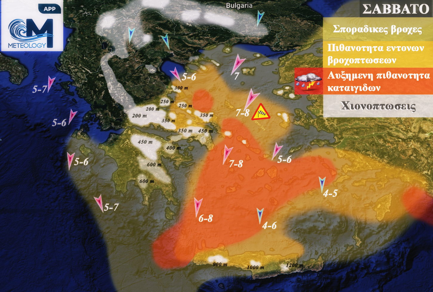 Σημαντική αλλαγή του καιρού στα ανατολικά ηπειρωτικά και το Αιγαίο το Σάββατο. Θυελλώδεις βοριάδες και κατακόρυφη πτώση της θερμοκρασίας, θα δώσουν αξιόλογες βροχές στα παράκτια και θαλάσσια τμήματα από το ύψος των Σποράδων και νοτιότερα, ενώ οι βροχές αυτές, θα μεταφράζονται σε χιονοπτώσεις, στα αναγραφόμενα υψόμετρα. Σημειώνεται, πως από αυτά τα υψόμετρα και πάνω, θα εντοπίζονται και οι χιονοστρώσεις, οι οποίες κατά τόπους θα ειναι αξιόλογες. Χιονοπτώσεις θα παρατηρηθούν πρόσκαιρα και σε χαμηλότερα υψόμετρα, ιδιαίτερα στο εσωτερικό της Στερεάς. Στην είσοδο του μετώπου, τα ξημερώματα του Σαββάτου, ίσως χιονίσει πρόσκαιρα και στον Έβρο.