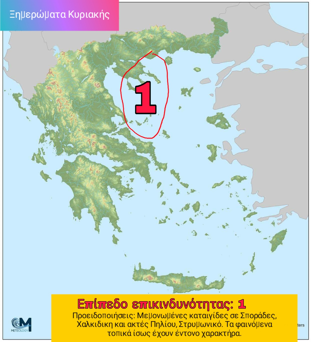 Πρόσκαιρη μεταβολή του καιρού τις επόμενες ώρες σε Χαλκιδική, Στρυμωνικό, κυρίως πρώτο πόδι ακτές Πηλίου και Σποράδες. Στις περιοχές αυτές, προς τα ξημερώματα της Κυριακής θα εκδηλωθούν μπόρες και τοπικές καταιγίδες. Τα φαινόμενα θα έχουν τοπικό χαρακτήρα και εμβέλεια, όμως δεν αποκλείεται να είναι και έντονα. Επίπεδο κινδύνου 1 εκδίδεται για τις παραπάνω περιοχές, για την πιθανότητα οι καταιγίδες που θα προκύψουν, να συνοδεύονται από ισχυρούς ανέμους ή και πρόσκαιρη χαλαζόπτωση. Τονίζεται πάντως πως τα φαινόμενα αν προκύψουν θα είναι τοπικά.