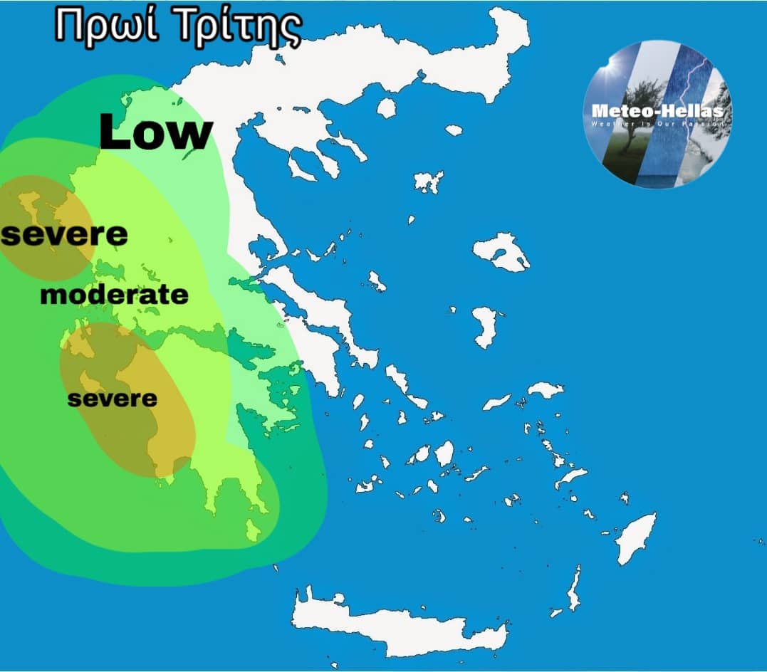 Με το σούρουπο και κυρίως την νύχτα προς Τετάρτη, ενώ ο καιρός θα έχει βελτιωθεί στα δυτικά και βόρεια, η έντονη καιρική δραστηριότητα θα εντοπίζεται στο Αιγαίο, με έμφαση στα ανατολικά τμήματα και τα Δωδεκάνησα. Εδώ οι καταιγίδες ίσως έχουν έντονο χαρακτήρα.