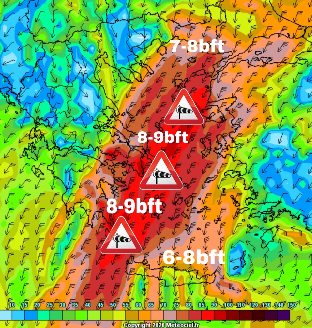 Σοβαρή ενίσχυση σε επίπεδα θυέλλης, θα παρουσιάσουν οι βοριάδες στο Αιγαίο και την Θράκη, από το απόγευμα περίπου της Κυριακής, έως και τα ξημερώματα της Τρίτης. Η κορύφωση της έντασης τους θα είναι η Δευτέρα, μέρα στην οποία οι θάλασσες θα καταστούν τρικυμιώδεις. Ως αποτέλεσμα αυτού, θα πρέπει να υπάρξουν σοβαρά προβλήματα στην εκτέλεση των ακτοπλοϊκών συγκοινωνιών, ενώ εξίσου δύσκολα έως και επικίνδυνη- θα γίνει η ρηψη του Σταυρού, ιδιαίτερα στα ανατολικά ηπειρωτικά και τα νησιά του Αιγαίου. Δυνατοί οι βοριάδες και στην Θράκη. Τις καλύτερες συνθήκες θα τις έχουμε στη δυτική και βόρεια χώρα από πλευράς ανέμων αλλά και φαινομένων. Δύσκολη μέρα η Δευτέρα στην Αττική, με τον ΒΑ να φτανει και τα 9 μποφόρ πρόσκαιρα! Δείξτε προσοχή σε αιωρούμενα αντικείμενα, μην παρκάρετε κάτω από δέντρα. Στην Θεσσαλονίκη, ο Βαρδάρης που θα ξεκινήσει από το Σάββατο, θα κορυφωθεί την Κυριακή σε εντασεις γύρω στα 6 μποφόρ.