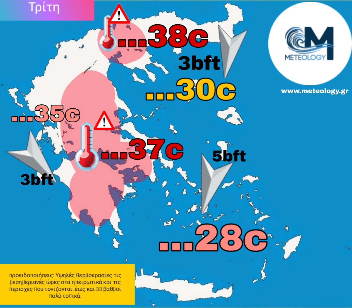 Πολύ υψηλές θερμοκρασίες αναμένουμε να σημειωθούν το μεσημέρι της Τρίτης σε πολλές ηπειρωτικες περιοχές της χώρας μας. Το μελτέμι στο Αιγαίο αντίθετα, θα κρατάει τον υδράργυρο σε περισσότερο ανεκτές τιμές. Τις υψηλότερες καταγραφές θα τις έχουμε σε Στερεά , Θεσσαλία και κεντρική Μακεδονία. Ιδιαίτερα στην τελευταία, ο ασθενής Βαρδάρης που θα φυσάει το μεσημέρι, θα βοηθήσει στο να έχουμε στην περιοχή αυτή ακόμη και 38 ίσως τοπικά και 39 βαθμούς στο εσωτερικό του κάμπου. Υψηλές θερμοκρασίες τόσο σε Αττική όσο και σε Θεσσαλονικη, με τον υδράργυρο και στις δύο πόλεις να φτάνει τους 35-36 βαθμούς τοπικά. Οι ευπαθείς ομάδες καλούνται να δείξουν προσοχή και να περιορίσουν τις μετακινήσεις τους.